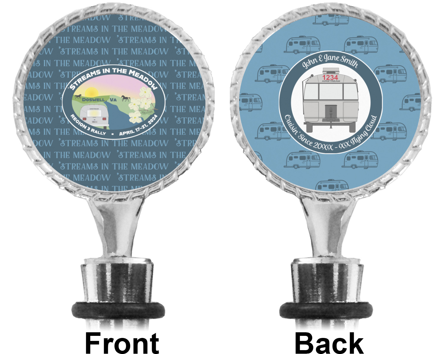 The top part of your bottle stopper is comprised of a zinc ring that displays your customization(s) in its middle, on both sides. The ring is heavy duty, with a bright chrome finish. The body of the wine stoppers have two silicone rings to provide an airtight seal. These wine bottle stoppers measure at 1.625" L x 0.8125" W x 4.625" H; your custom wine stopper is meant to fit into most standard-sized wine bottles.