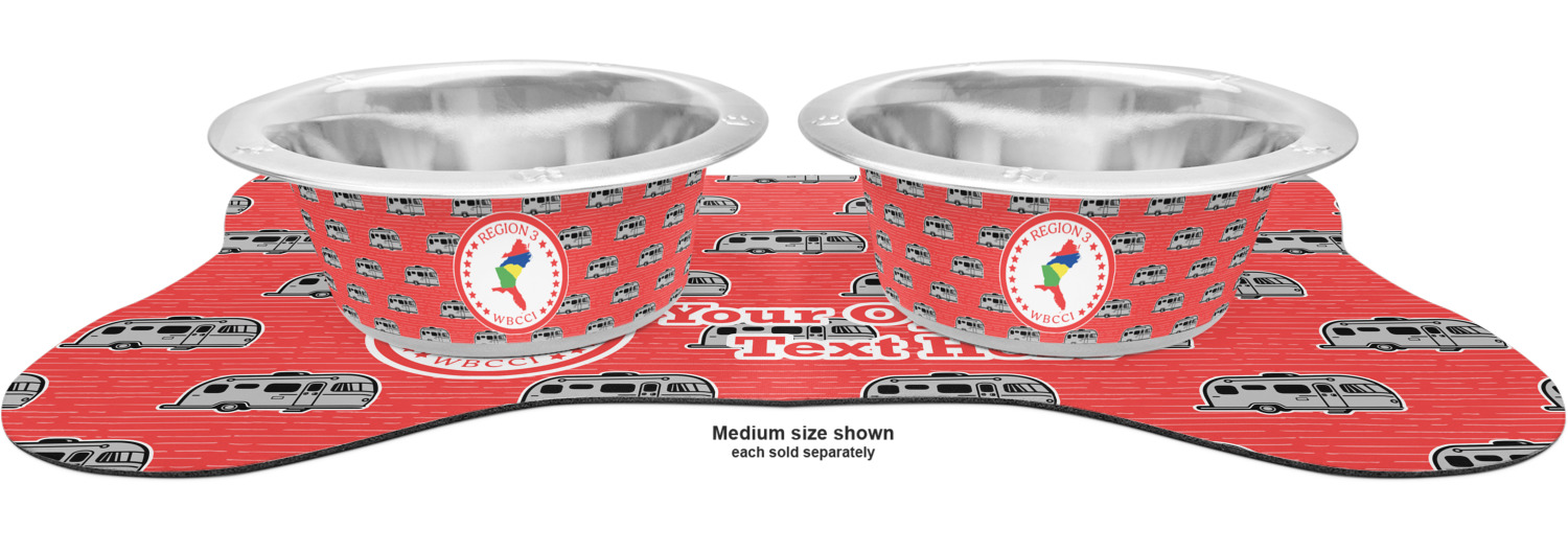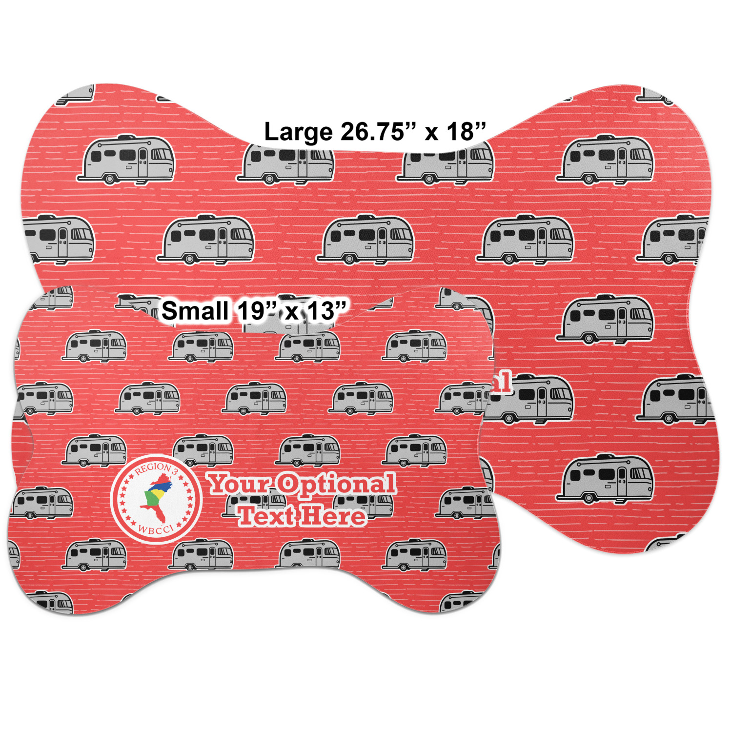 The top of this mat displays your custom design, as it is printed on polyester. To prevent slippage, the underside of the mat is made of rubber. We offer a small dog food mat, suitable for smaller dogs and a large dog food mat for bigger breeds. The small dog food mat is approximately 19 by 13 inches, while the large dog feeding mat measures at approximately 26.75 by 18 inches. Both personalized mats are ideally sized to fit two dog bowls.