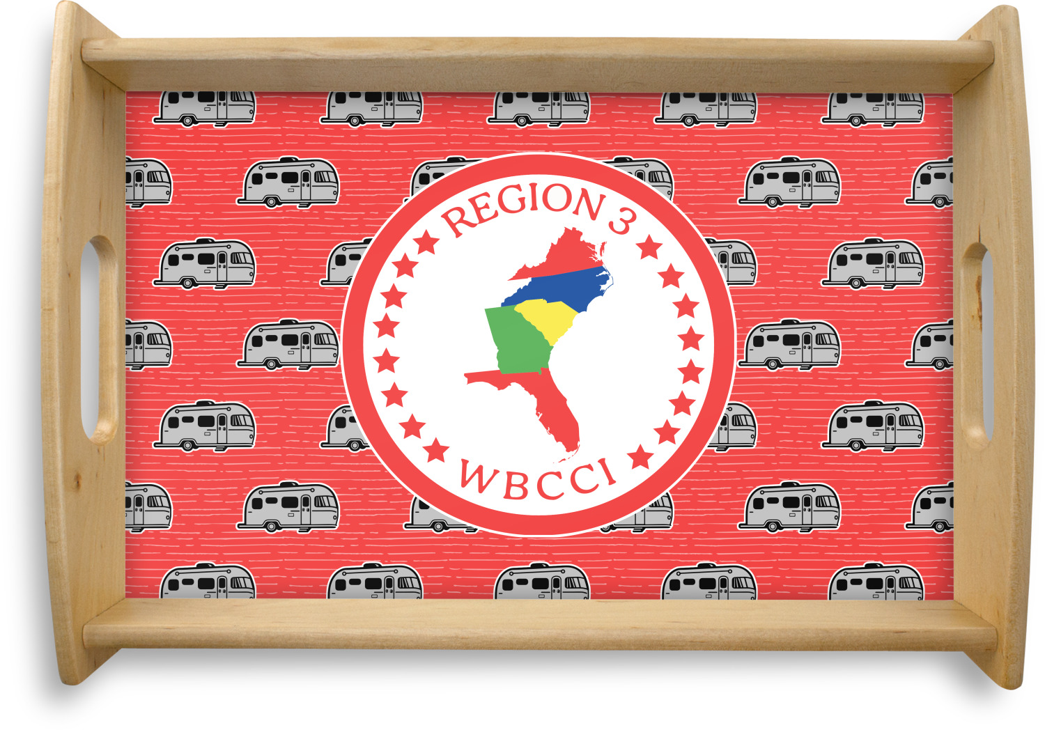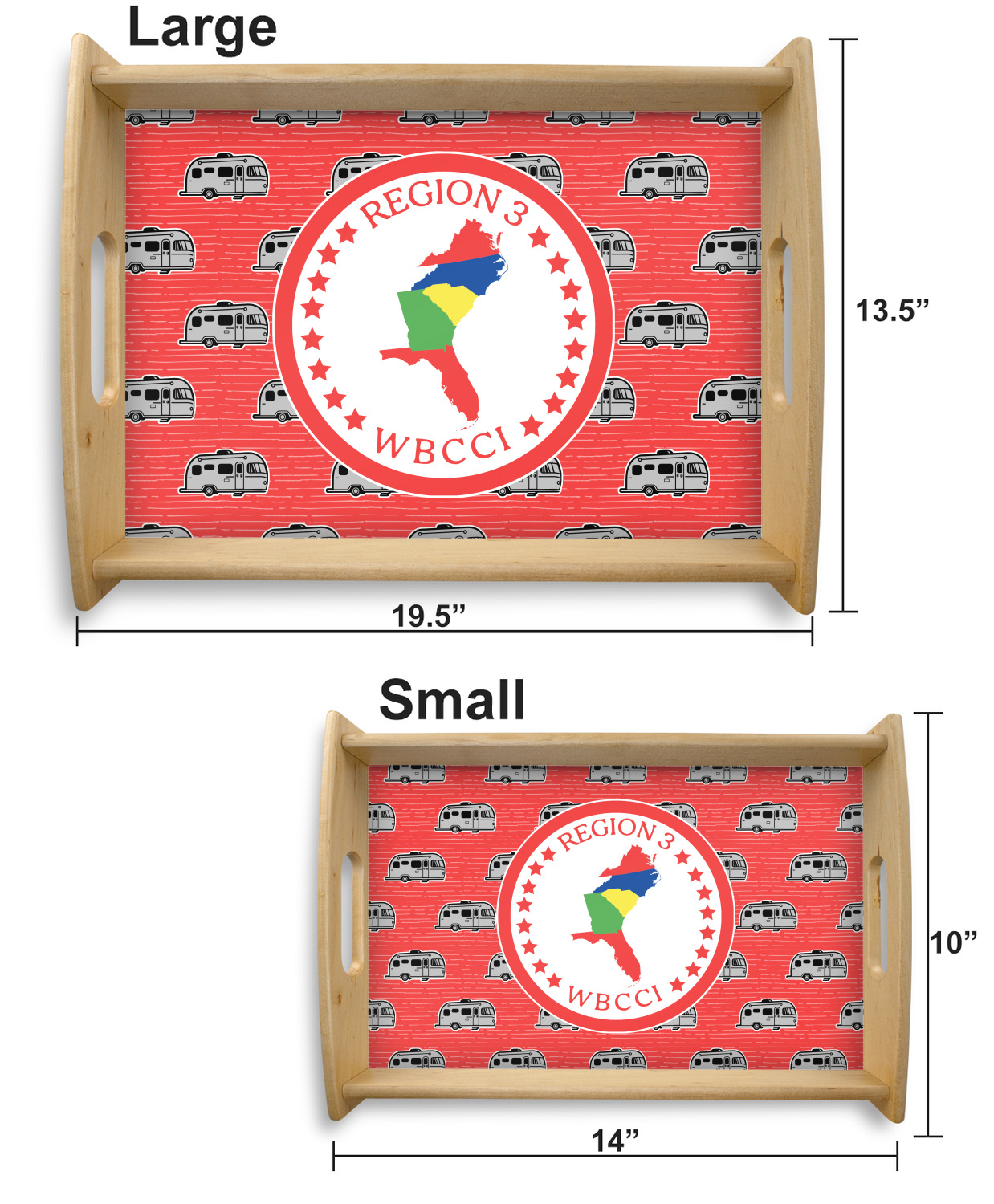 This serving tray with handles features square edges and two rounded sides, creating a very modern look. Each side is fabricated from a beautifully cut, natural wood. The bottom of the interior of the tray displays your customized design in bright, vibrant color. The tray is sold in both a black color and a natural wood look. Each variation of the wood serving tray has two sizes: Small, which is 14" x 10" x 2.25", and Large, which is 19.5" x 13.5" x 2.75".