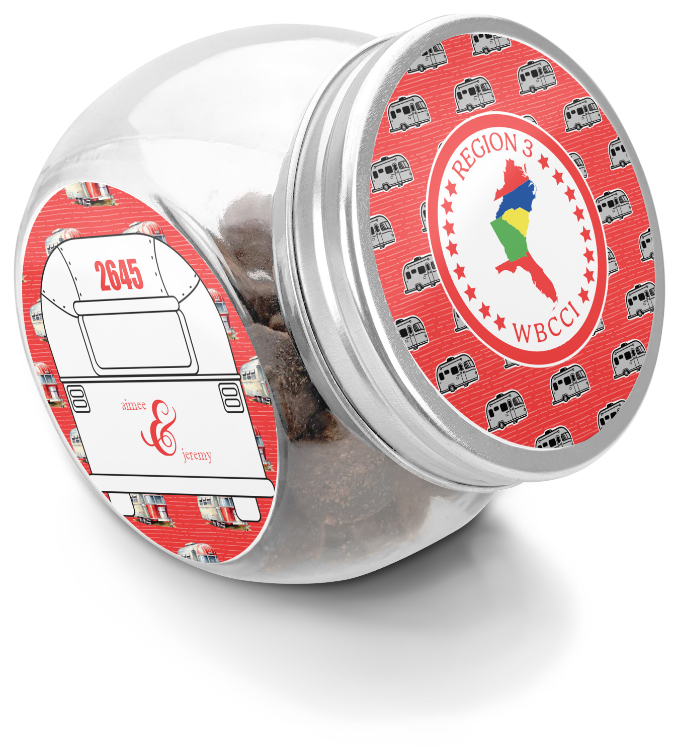 This treat jar is an excellent way to store treats for your favorite canine or feline. Moreover, their delicate, classy appearance makes them a tasteful addition to your countertop's décor. Crafted from clear glass, its unique construction and silver metal, screw-on lid allows for quick and easy access. Three, permanent, vinyl stickers are applied to both sides of the jar and lid, presenting your personalized design. The base of this glass, dog treat jar is 3.4" x 4.75", and the jar stands at 5" tall. Though on the smaller side, this jar is best suited for smaller treats or training treats.