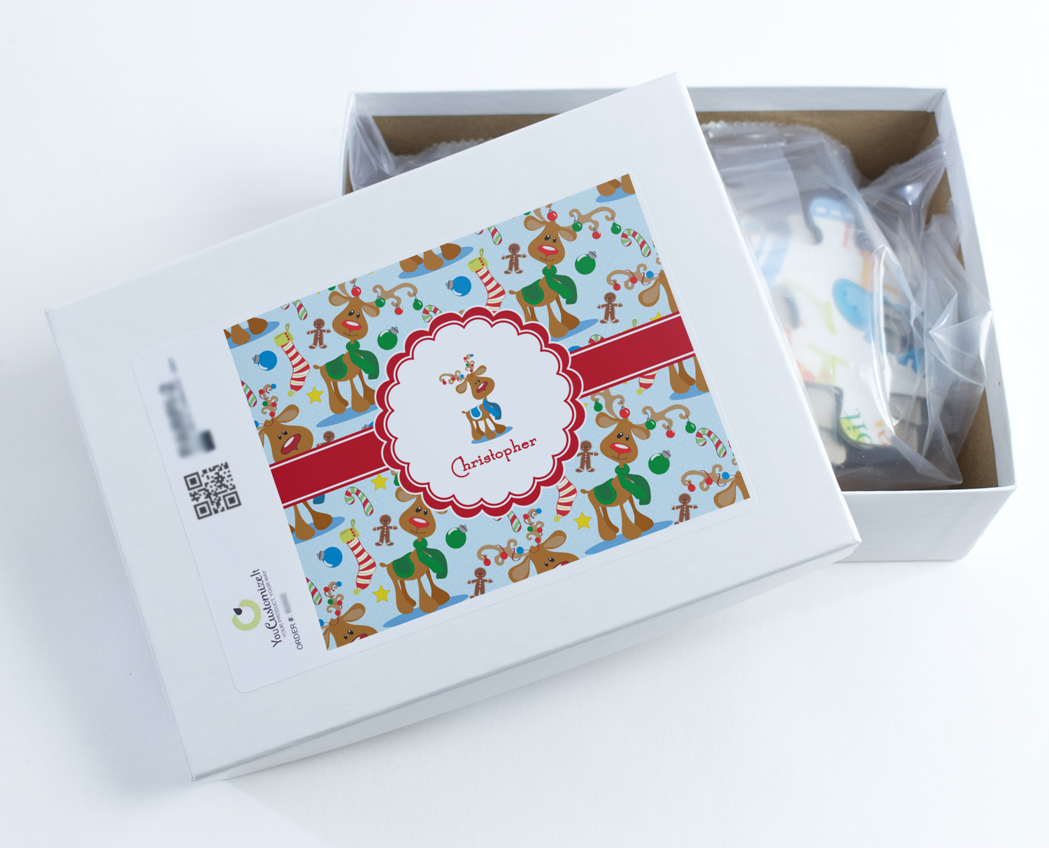 Who doesn't love reindeer? Everyone can agree this fun design of Santa's famous helpers clad in festive scarves and ornaments on their antlers, surrounded by candy canes, gingerbread men, and Christmas stockings, likely stuffed with even more goodies, is absolutely adorable. The ribbon and label are red, and the label includes a little reindeer, ready for the holidays, along with your name or text for personalization.