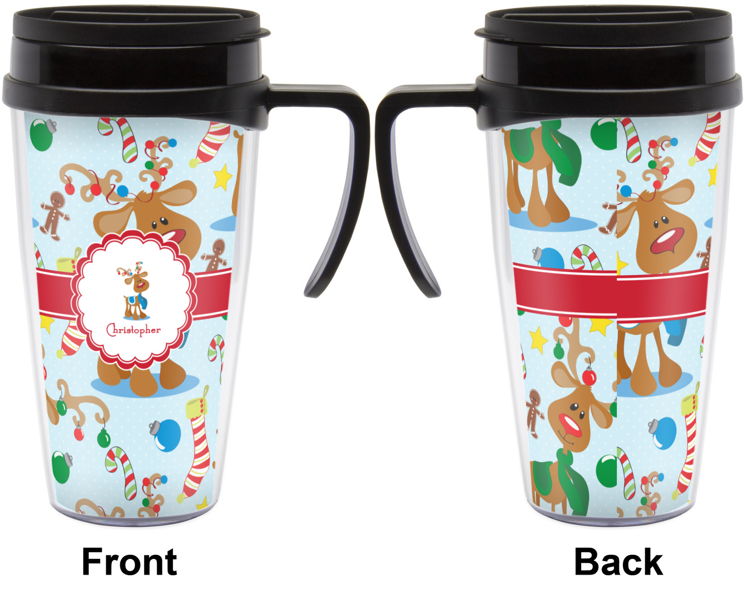 These thermal mugs are free of BPA, and insulated, to keep your drinks hot or cold. The black, snap on lid and the slider for sipping allows you to conveniently sip your drink without constantly worrying about a disastrous spill. We offer this mug with and without a handle, to better suit your needs. Each custom thermal mug holds up to 16 ounces of liquid and displays your customization on all sides on premium gloss media inserts.