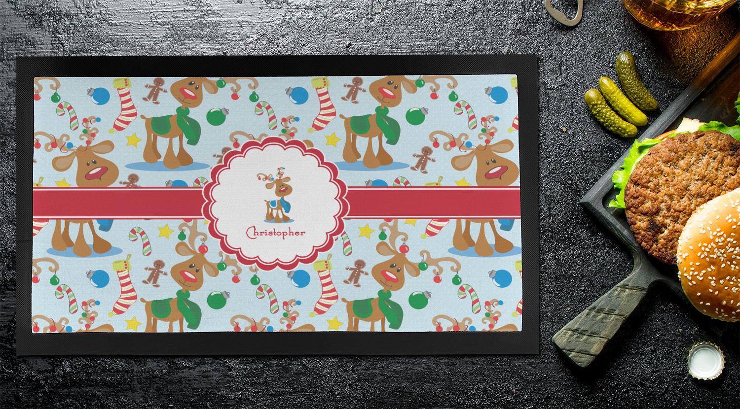 Who doesn't love reindeer? Everyone can agree this fun design of Santa's famous helpers clad in festive scarves and ornaments on their antlers, surrounded by candy canes, gingerbread men, and Christmas stockings, likely stuffed with even more goodies, is absolutely adorable. The ribbon and label are red, and the label includes a little reindeer, ready for the holidays, along with your name or text for personalization.