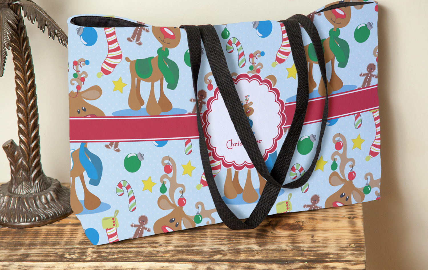 These beach totes are handmade here in the USA. Fabric is printed with your design. The tote is then sewn from the fabric pieces, lining and handles added.