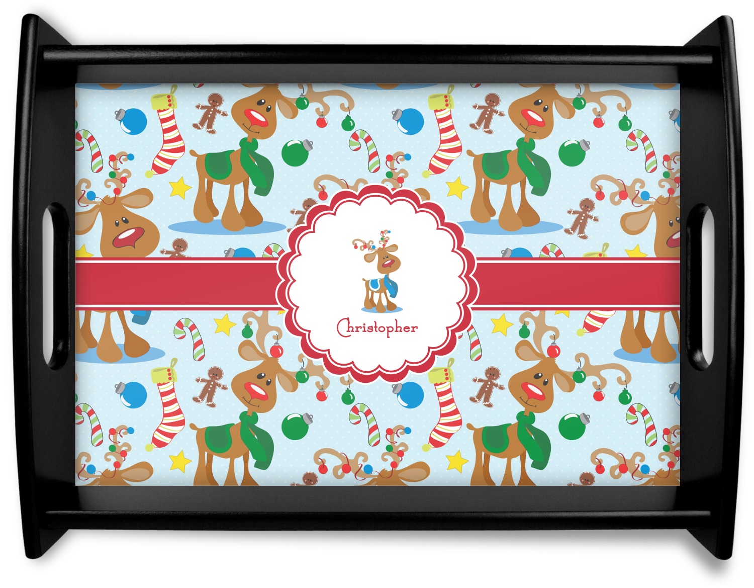 This serving tray with handles features square edges and two rounded sides, creating a very modern look. Each side is fabricated from a beautifully cut, natural wood. The bottom of the interior of the tray displays your customized design in bright, vibrant color. The tray is sold in both a black color and a natural wood look. Each variation of the wood serving tray has two sizes: Small, which is 14" x 10" x 2.25", and Large, which is 19.5" x 13.5" x 2.75".