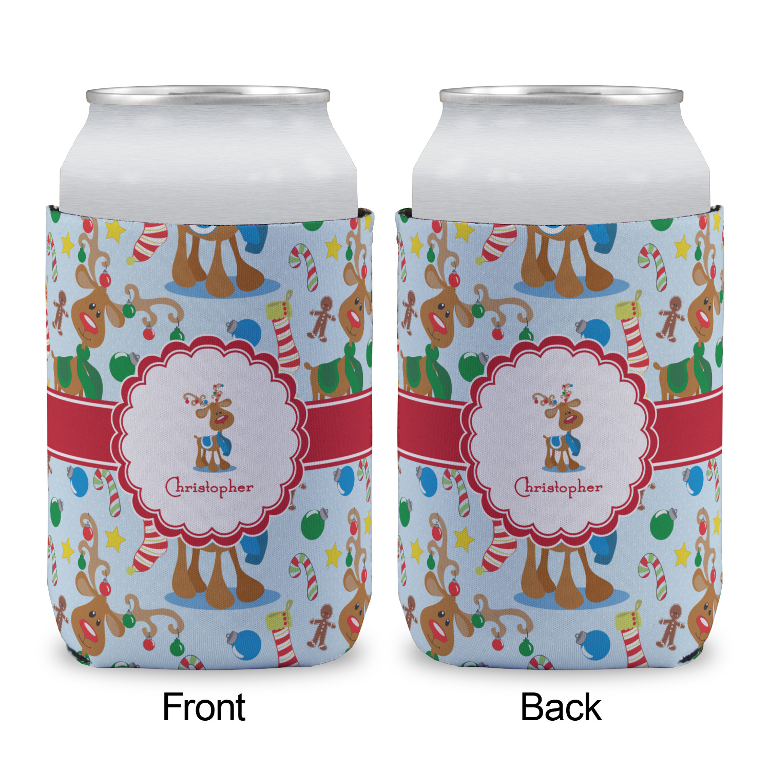 Who doesn't love reindeer? Everyone can agree this fun design of Santa's famous helpers clad in festive scarves and ornaments on their antlers, surrounded by candy canes, gingerbread men, and Christmas stockings, likely stuffed with even more goodies, is absolutely adorable. The ribbon and label are red, and the label includes a little reindeer, ready for the holidays, along with your name or text for personalization.