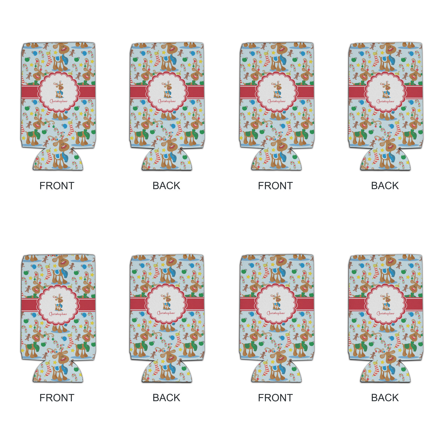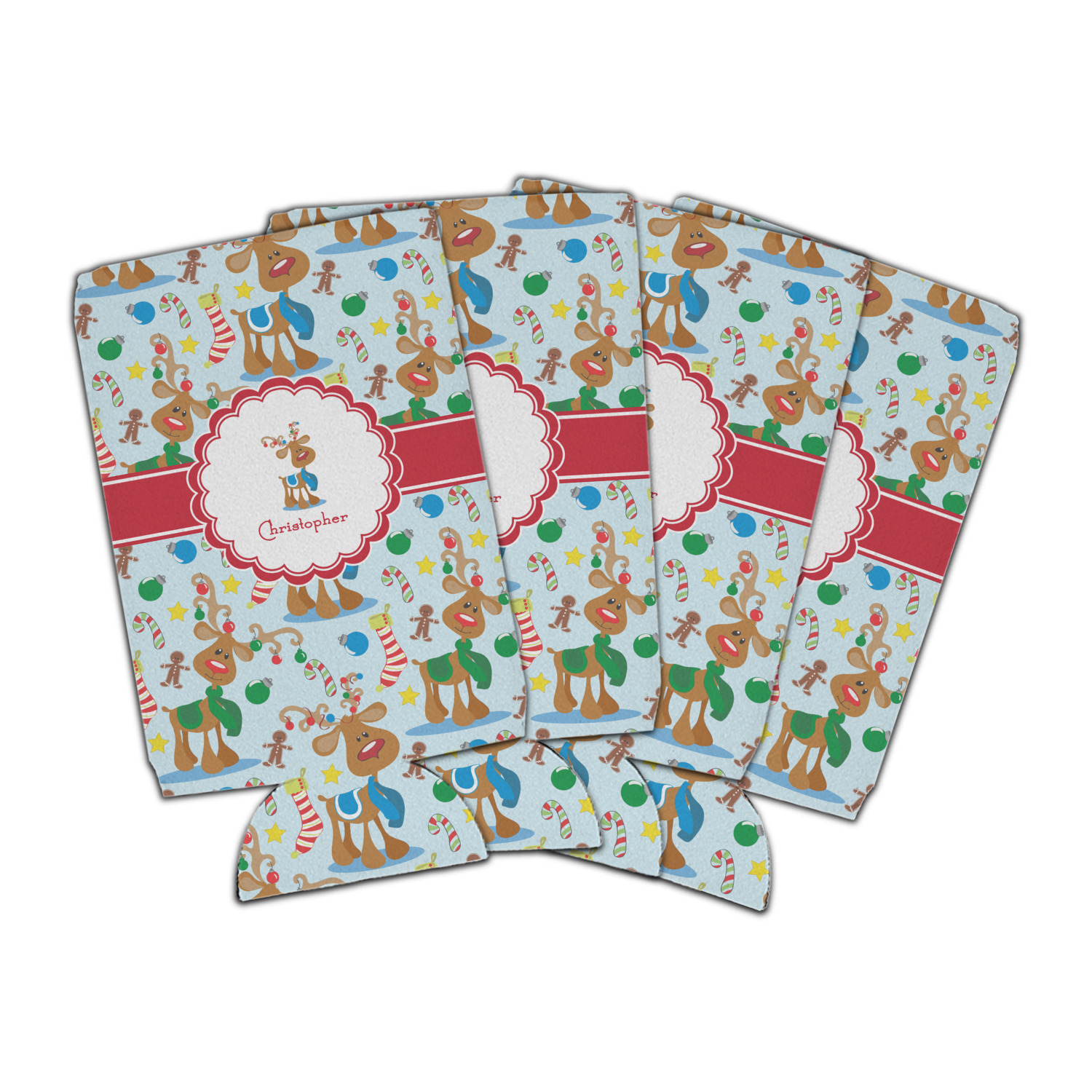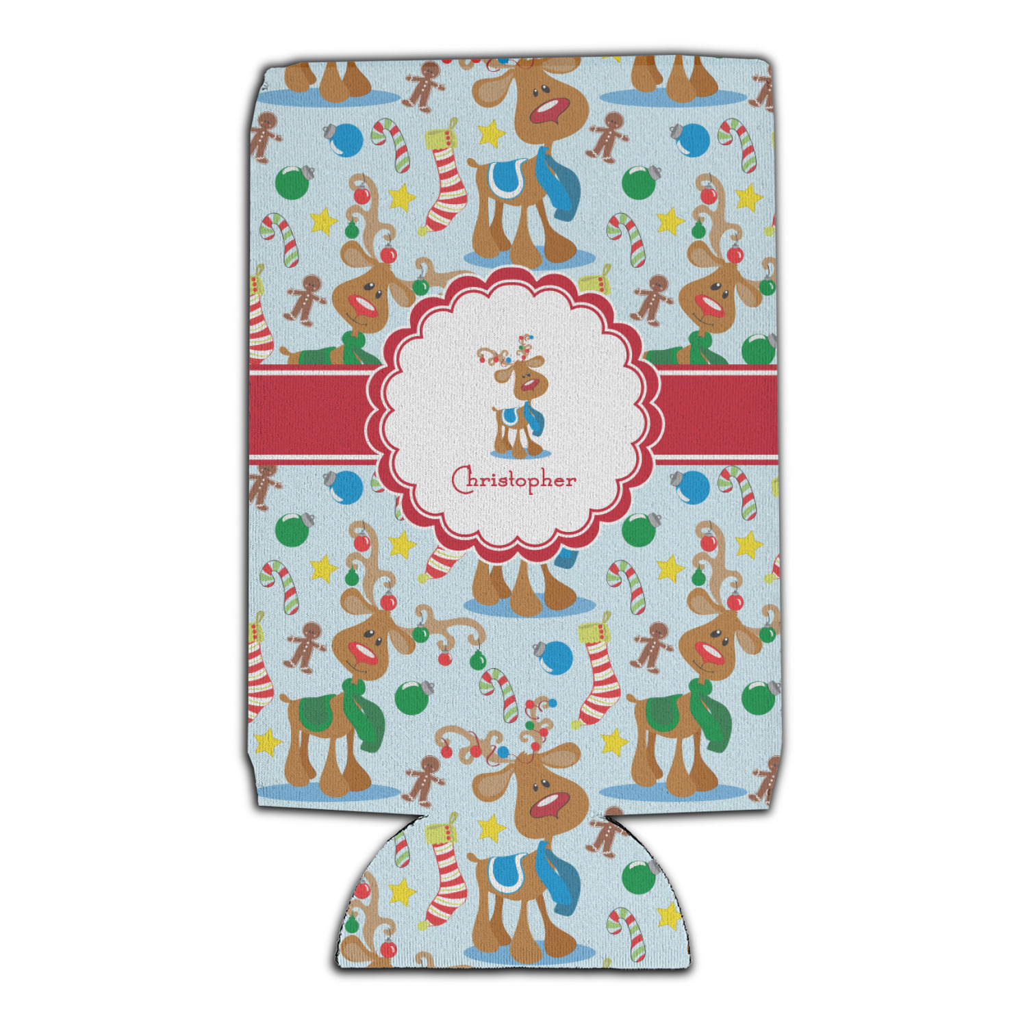 Who doesn't love reindeer? Everyone can agree this fun design of Santa's famous helpers clad in festive scarves and ornaments on their antlers, surrounded by candy canes, gingerbread men, and Christmas stockings, likely stuffed with even more goodies, is absolutely adorable. The ribbon and label are red, and the label includes a little reindeer, ready for the holidays, along with your name or text for personalization.