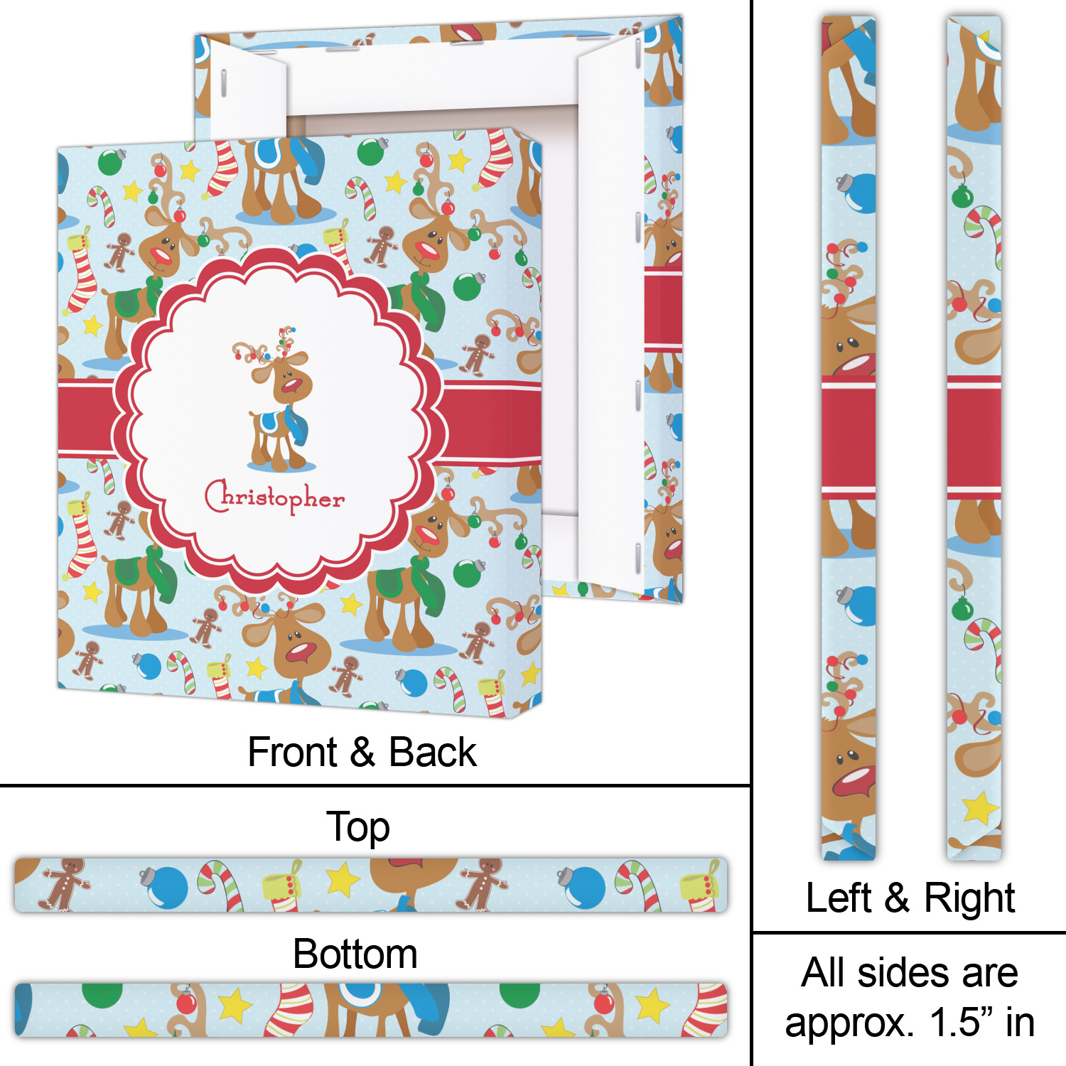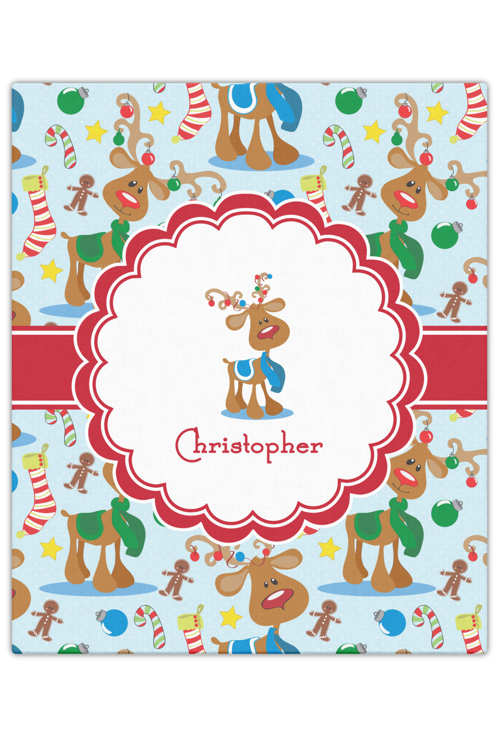 Who doesn't love reindeer? Everyone can agree this fun design of Santa's famous helpers clad in festive scarves and ornaments on their antlers, surrounded by candy canes, gingerbread men, and Christmas stockings, likely stuffed with even more goodies, is absolutely adorable. The ribbon and label are red, and the label includes a little reindeer, ready for the holidays, along with your name or text for personalization.