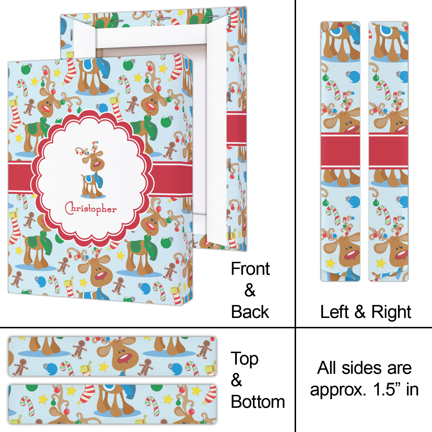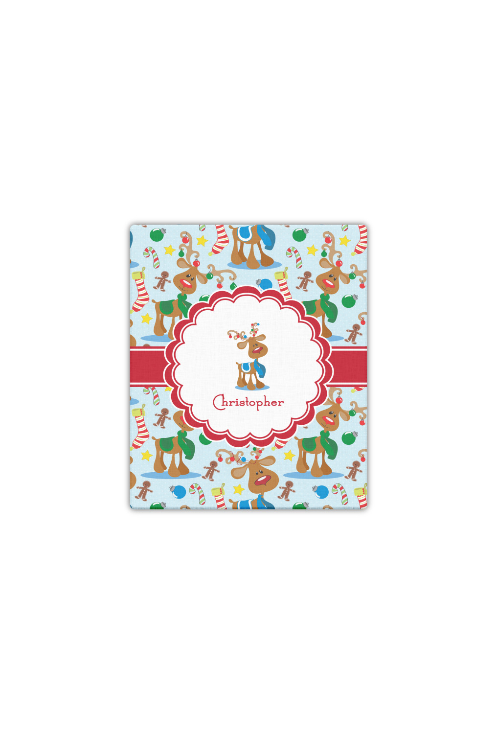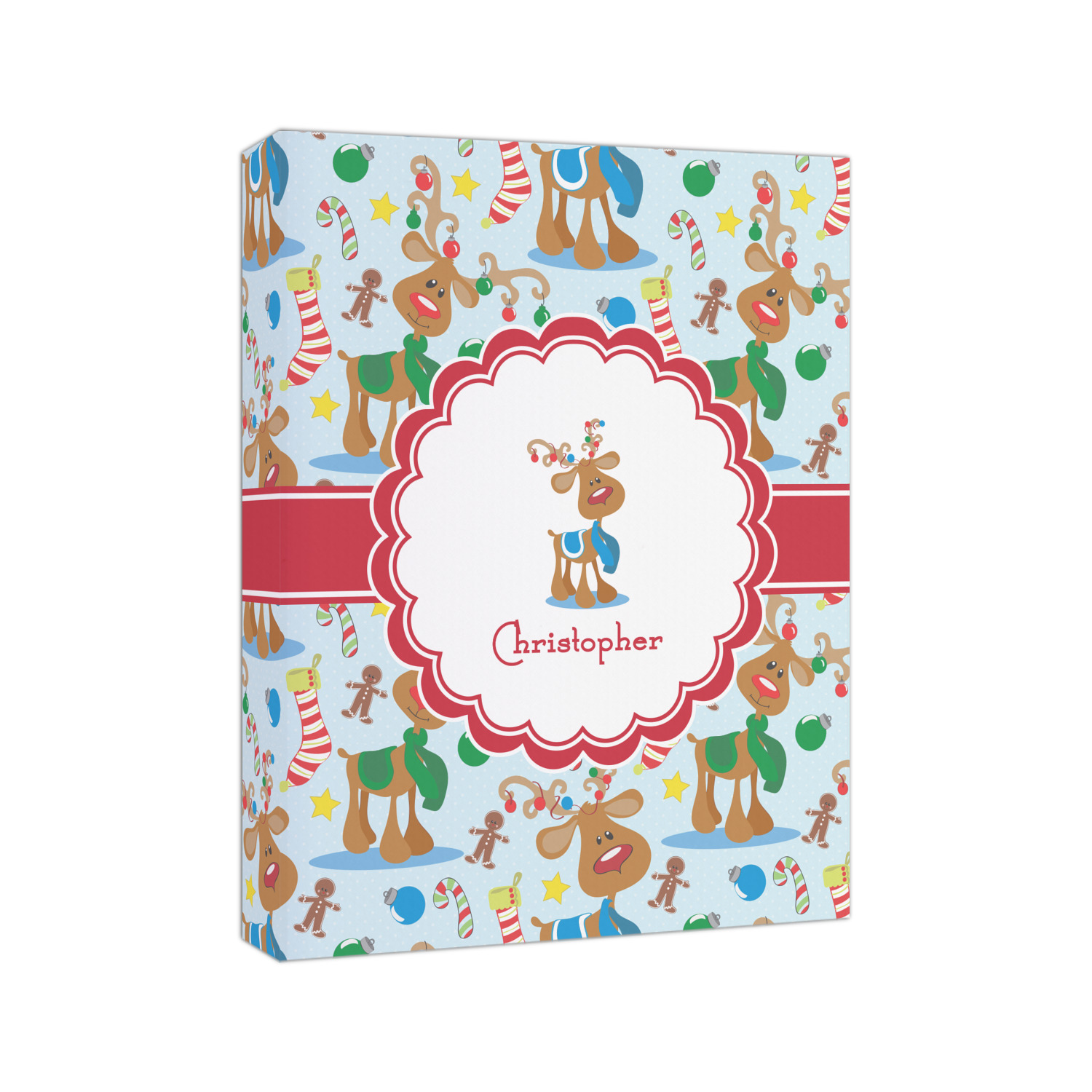 Who doesn't love reindeer? Everyone can agree this fun design of Santa's famous helpers clad in festive scarves and ornaments on their antlers, surrounded by candy canes, gingerbread men, and Christmas stockings, likely stuffed with even more goodies, is absolutely adorable. The ribbon and label are red, and the label includes a little reindeer, ready for the holidays, along with your name or text for personalization.