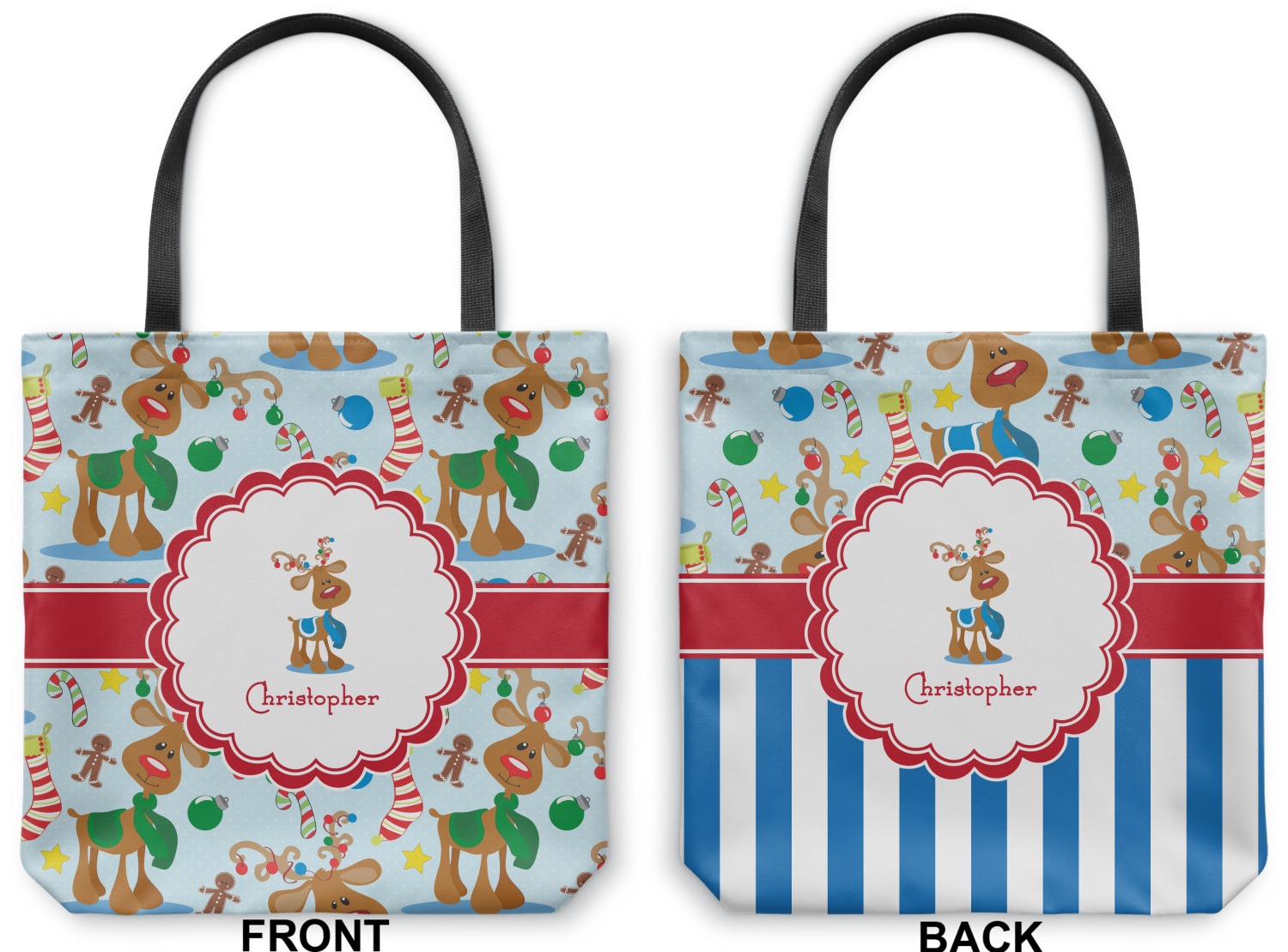 Who doesn't love reindeer? Everyone can agree this fun design of Santa's famous helpers clad in festive scarves and ornaments on their antlers, surrounded by candy canes, gingerbread men, and Christmas stockings, likely stuffed with even more goodies, is absolutely adorable. The ribbon and label are red, and the label includes a little reindeer, ready for the holidays, along with your name or text for personalization.