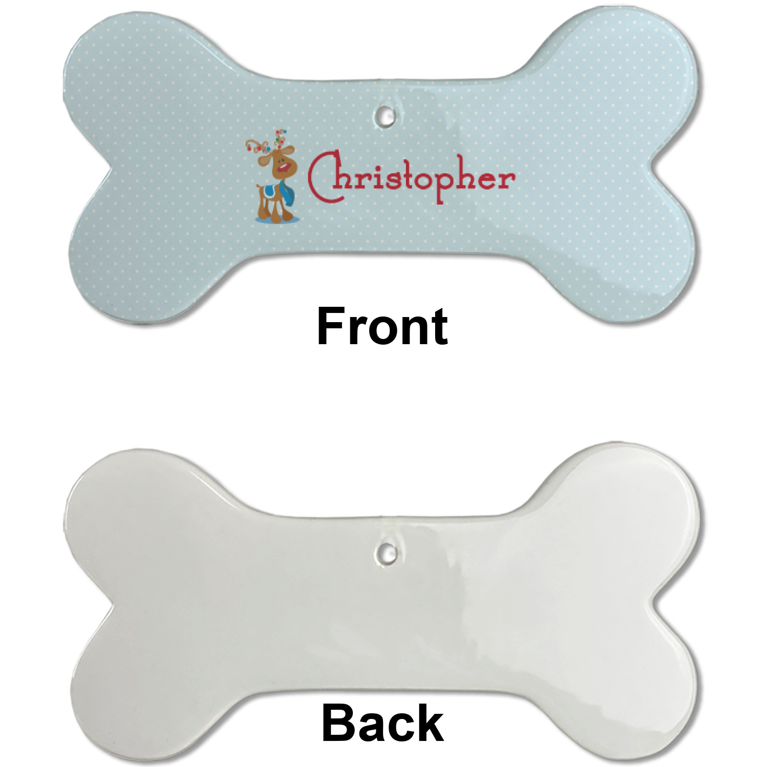 Our dog Christmas ornaments are a ceramic material with a bone-shaped structure hung horizontally. We offer two printing styles to personalize your furry friend's ornament! Choose a one-sided printing, perfect for wall decor, memorial accessory, or doghouse nameplate! Create a double-sided ornament perfect for adorning the Christmas tree. Each dog bone ornament is approximately 4.75" x 2.25" and is printed here in the USA.