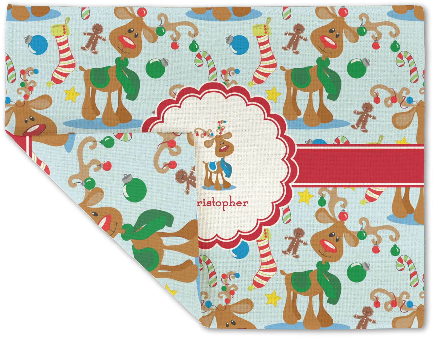 Who doesn't love reindeer? Everyone can agree this fun design of Santa's famous helpers clad in festive scarves and ornaments on their antlers, surrounded by candy canes, gingerbread men, and Christmas stockings, likely stuffed with even more goodies, is absolutely adorable. The ribbon and label are red, and the label includes a little reindeer, ready for the holidays, along with your name or text for personalization.