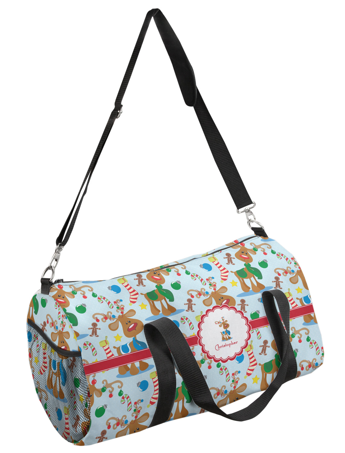 This duffle is a sturdy bag made of a canvas material. It comes in two sizes: Small (19"W x 9.5"H x 9.5"D) and Large (23"W x 12"H x 12"D). The bag is a cylindrical shape with a black adjustable strap and two handles. On one side is an elastic pouch to put a waterbottle or other small item. Your product will be sublimated with your design and is able to be designed on the front, back, and sides. Be sure to remember that the straps may cut into parts of your design if you upload your own artwork.