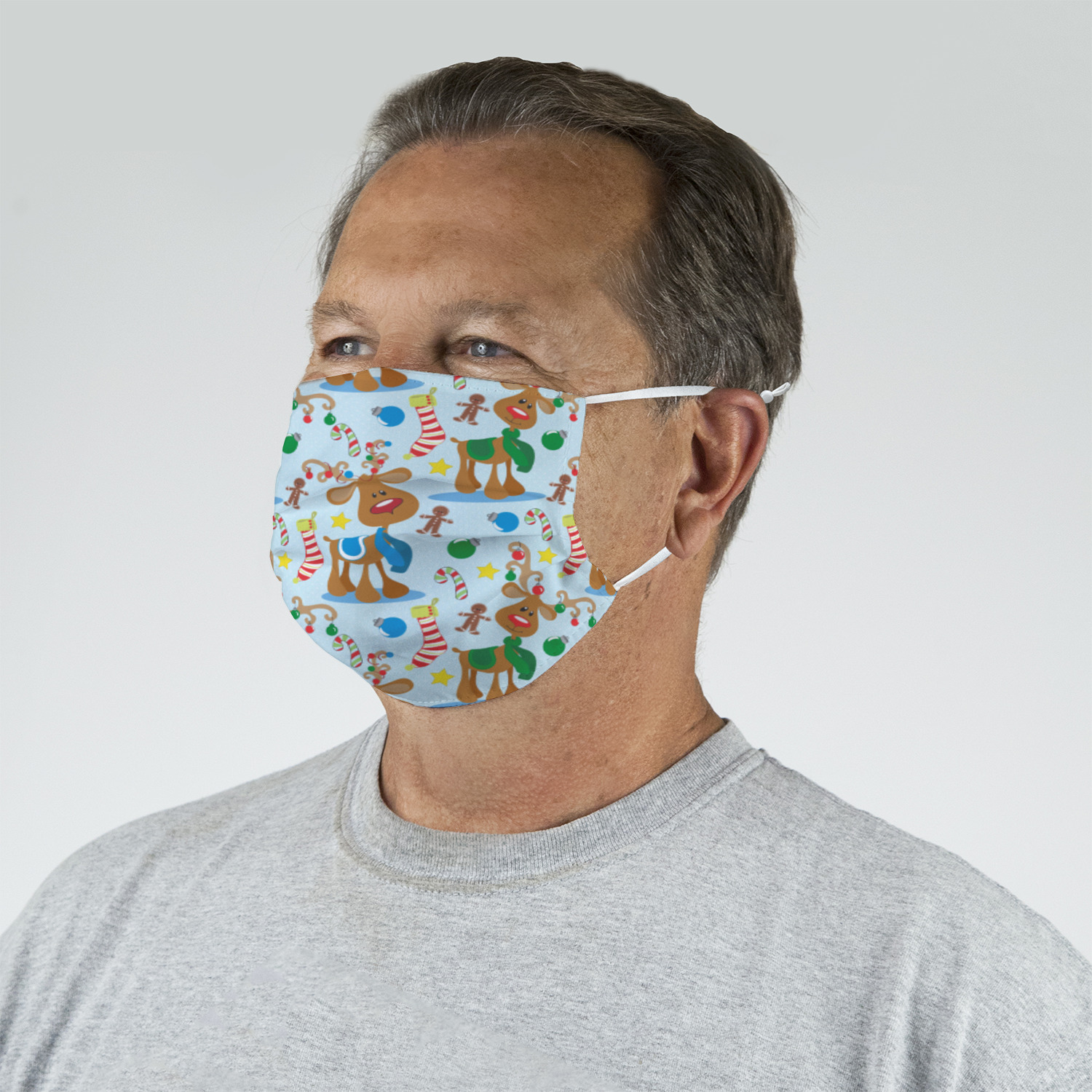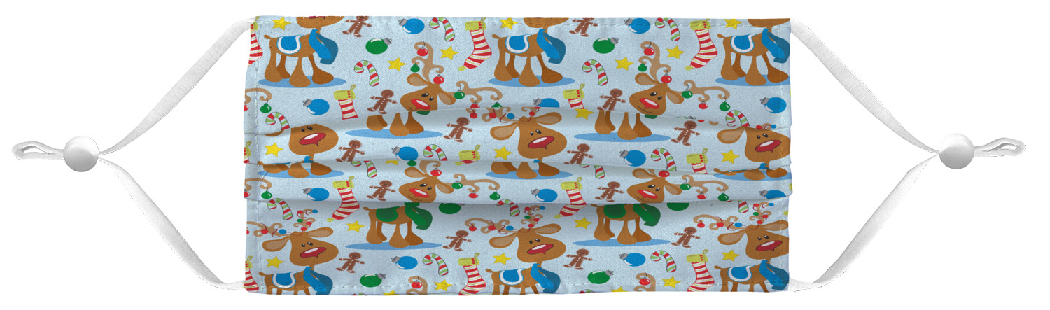 These fun face masks are 7" wide and 3.5" high. They feature pleats, adjustable ear loops, and are made with two layers of fabric. The top layer where your design is printed is a breathable polyester sheeting, while the inside layer is a soft microfiber polyester