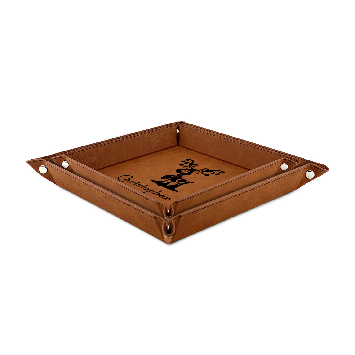 The leatherette wraps the hard board base and sides with flexible hinges to fold the sides up. The corners are secured using silver snaps. The 6in x 6 in tray measures approximately 9.5in x 9.5in when laid flat. The 9in x 9in tray measures approximately 13in x 13in when laid flat.