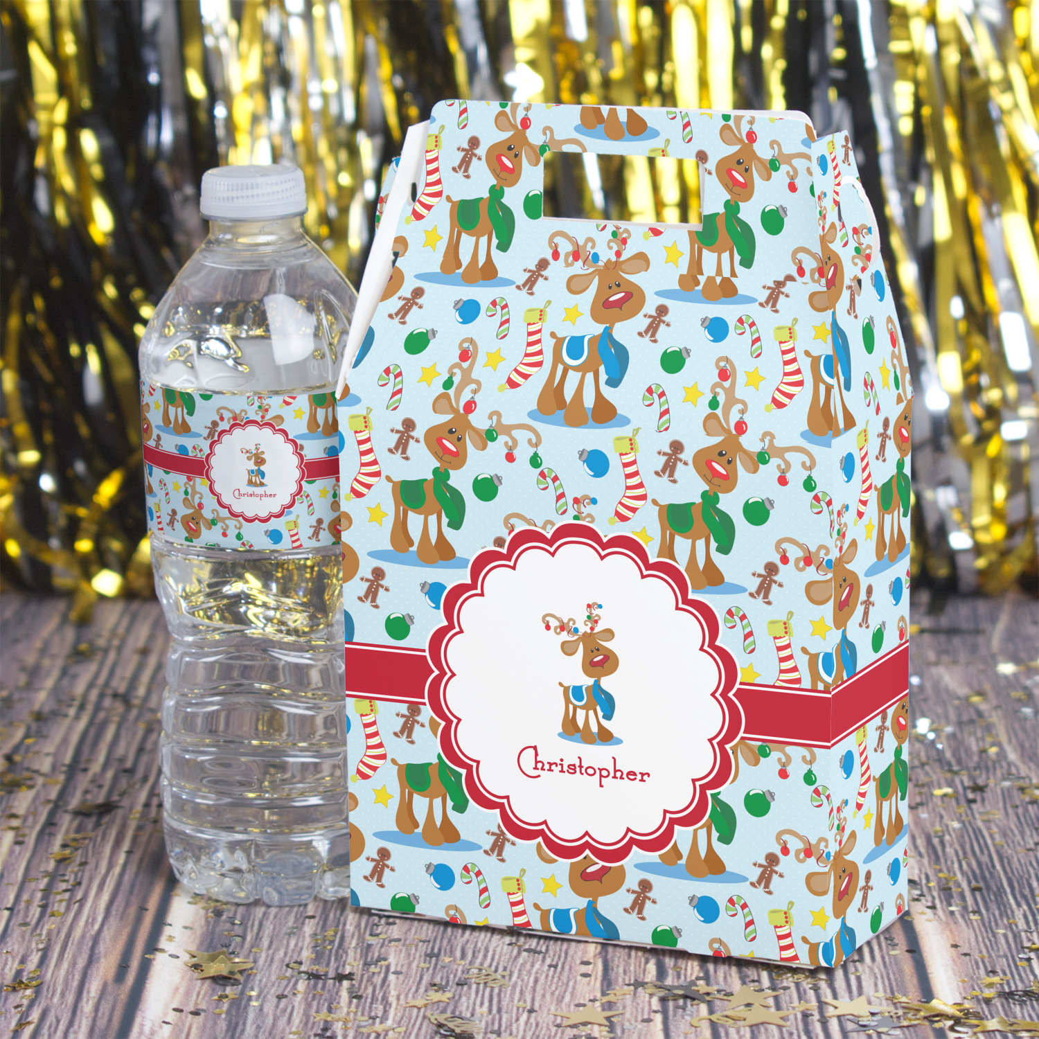 Who doesn't love reindeer? Everyone can agree this fun design of Santa's famous helpers clad in festive scarves and ornaments on their antlers, surrounded by candy canes, gingerbread men, and Christmas stockings, likely stuffed with even more goodies, is absolutely adorable. The ribbon and label are red, and the label includes a little reindeer, ready for the holidays, along with your name or text for personalization.