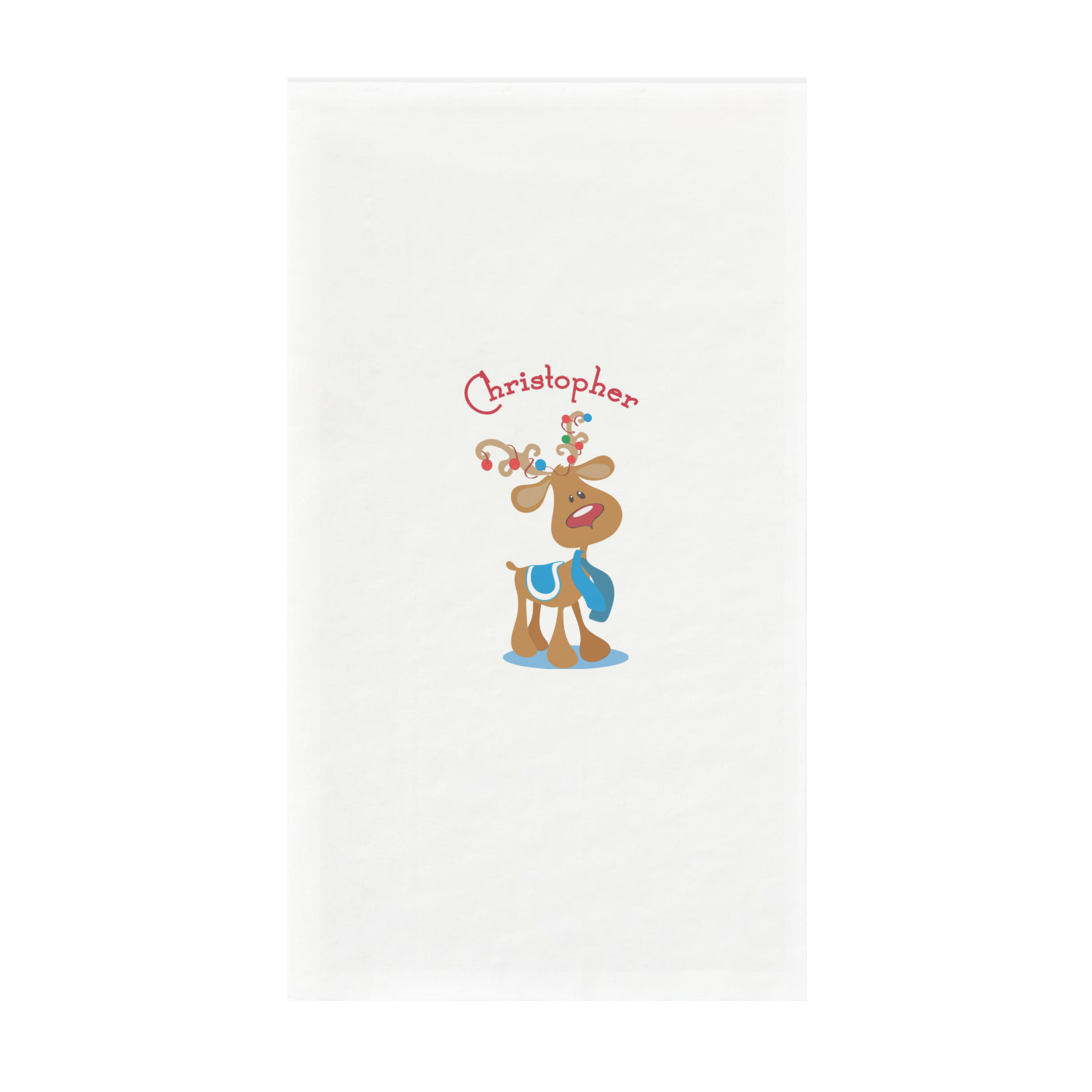 Who doesn't love reindeer? Everyone can agree this fun design of Santa's famous helpers clad in festive scarves and ornaments on their antlers, surrounded by candy canes, gingerbread men, and Christmas stockings, likely stuffed with even more goodies, is absolutely adorable. The ribbon and label are red, and the label includes a little reindeer, ready for the holidays, along with your name or text for personalization.