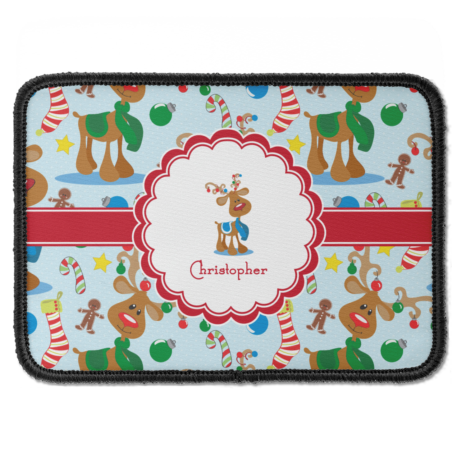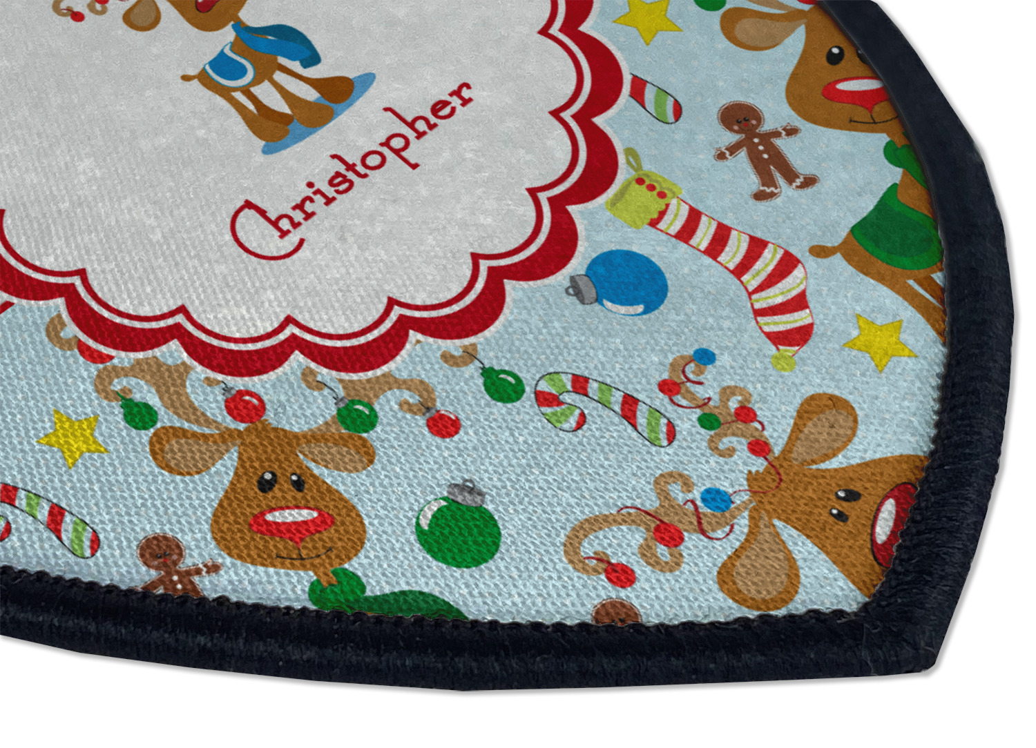 Who doesn't love reindeer? Everyone can agree this fun design of Santa's famous helpers clad in festive scarves and ornaments on their antlers, surrounded by candy canes, gingerbread men, and Christmas stockings, likely stuffed with even more goodies, is absolutely adorable. The ribbon and label are red, and the label includes a little reindeer, ready for the holidays, along with your name or text for personalization.