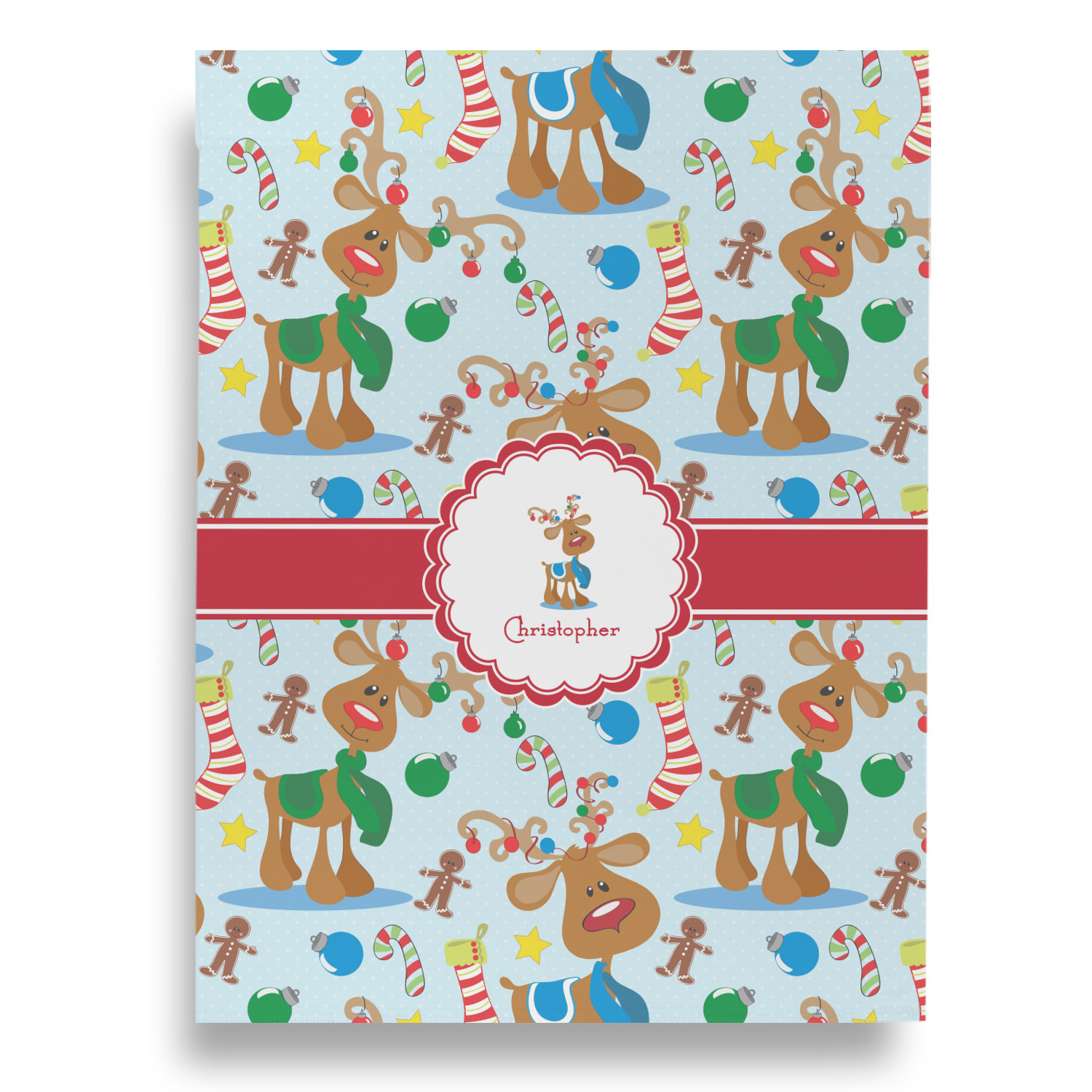 Who doesn't love reindeer? Everyone can agree this fun design of Santa's famous helpers clad in festive scarves and ornaments on their antlers, surrounded by candy canes, gingerbread men, and Christmas stockings, likely stuffed with even more goodies, is absolutely adorable. The ribbon and label are red, and the label includes a little reindeer, ready for the holidays, along with your name or text for personalization.