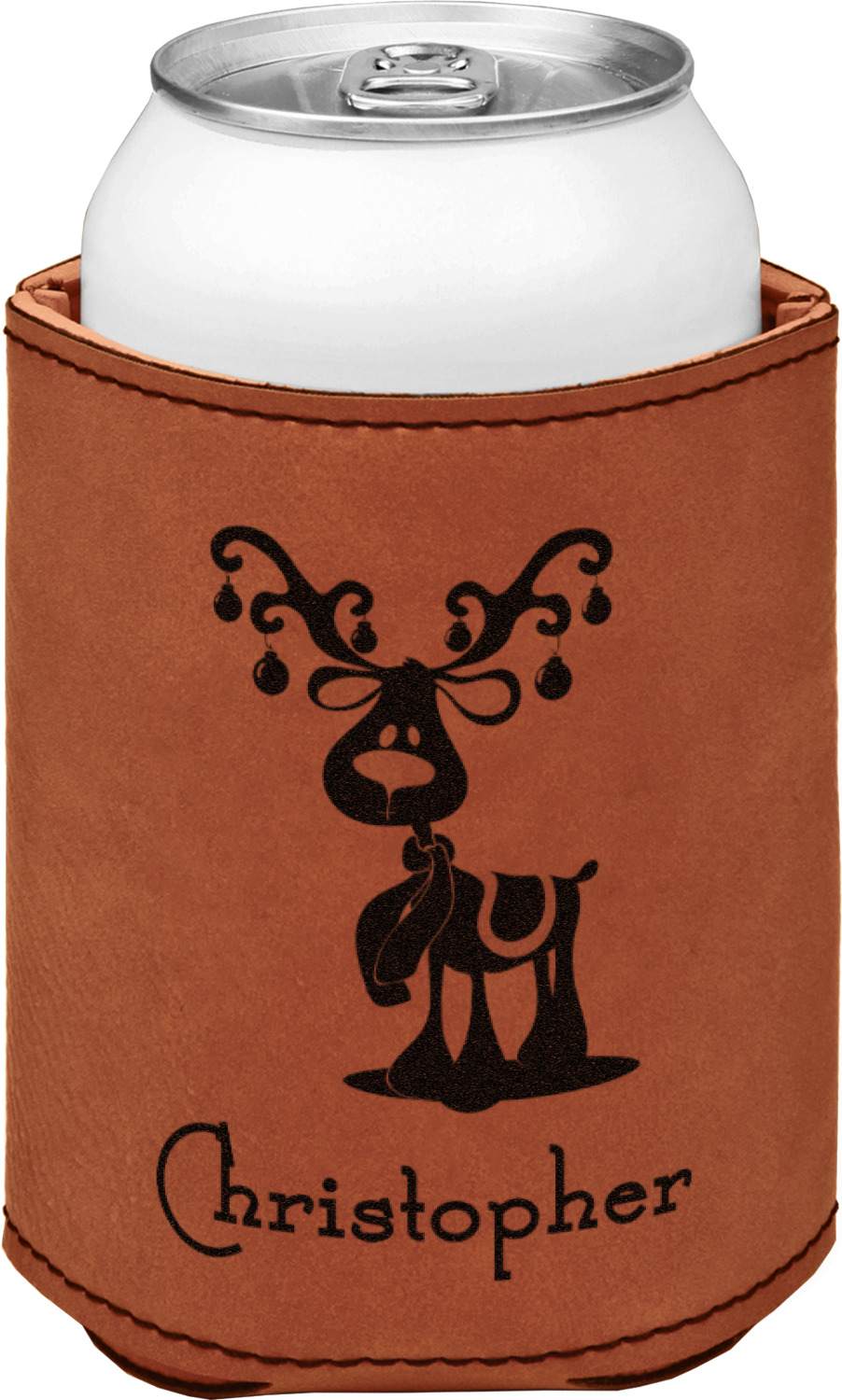 This can sleeve is made from a cognac-brown leatherette and stitched with a sturdy, black thread. A slim padding lines the inside of your can sleeve to allow for a better fit once your drink is inserted. The sleeve itself measures at 4 by 4.5 inches, allowing this custom can sleeve to accommodate most canned drinks. Your personalized design can be engraved on the front and back, or solely the front. When laser-engraved, your design appears as a black coloration which contrasts the leatherette nicely.