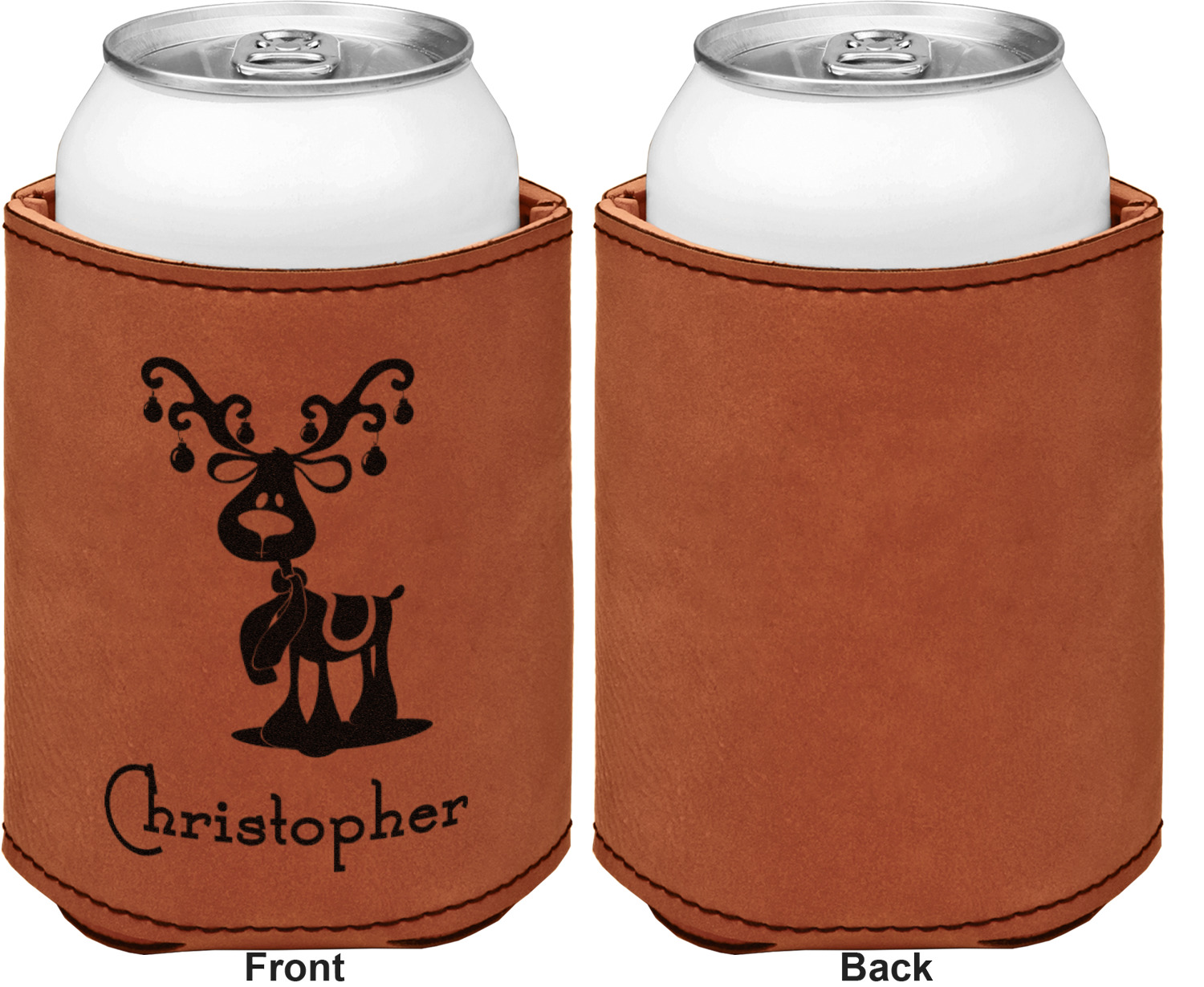 This can sleeve is made from a cognac-brown leatherette and stitched with a sturdy, black thread. A slim padding lines the inside of your can sleeve to allow for a better fit once your drink is inserted. The sleeve itself measures at 4 by 4.5 inches, allowing this custom can sleeve to accommodate most canned drinks. Your personalized design can be engraved on the front and back, or solely the front. When laser-engraved, your design appears as a black coloration which contrasts the leatherette nicely.