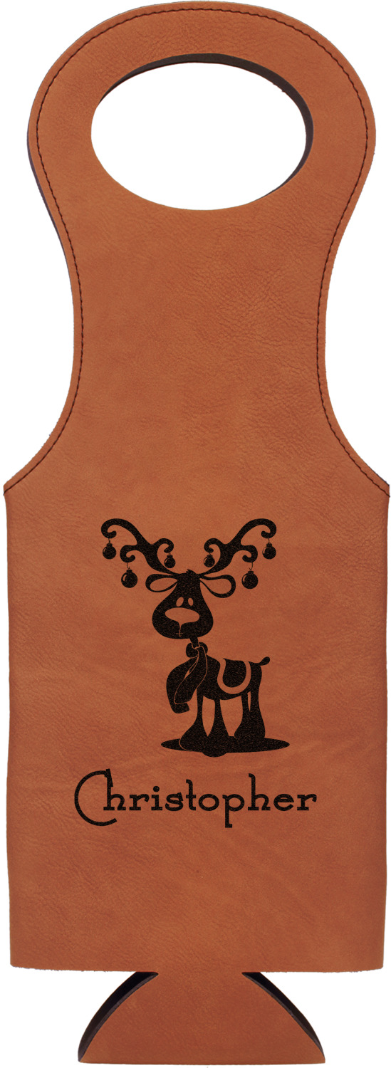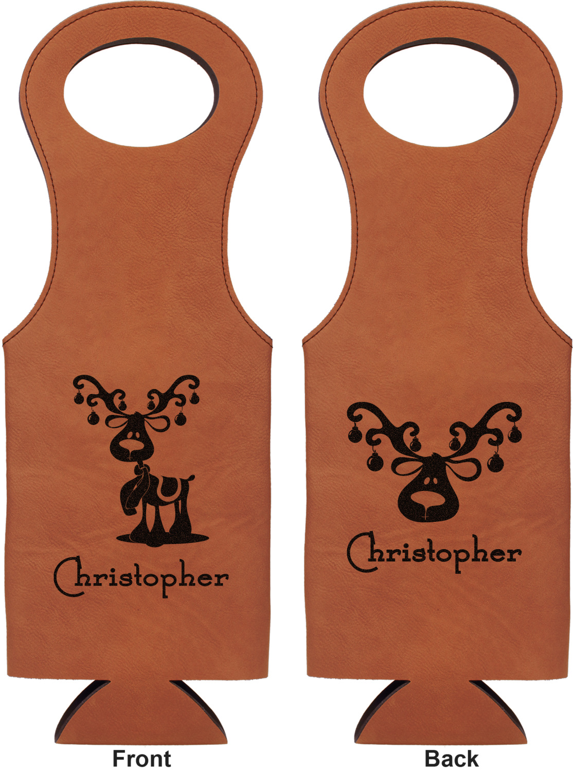 This wine carrier is made from a stunning leatherette, in a cognac-brown color. Strong, black stitching lines the sides of your wine bottle bag and provides extra durability. The interior is lined with a padded, black material to allow for a snug fit once your bottle is placed inside. At the top of this wine gift bag, you'll find two oval shaped handles that elegantly complements the rest of the bag's style. We provide you with the option of laser-engraving the front, or the front and back of your new personalized wine bag!