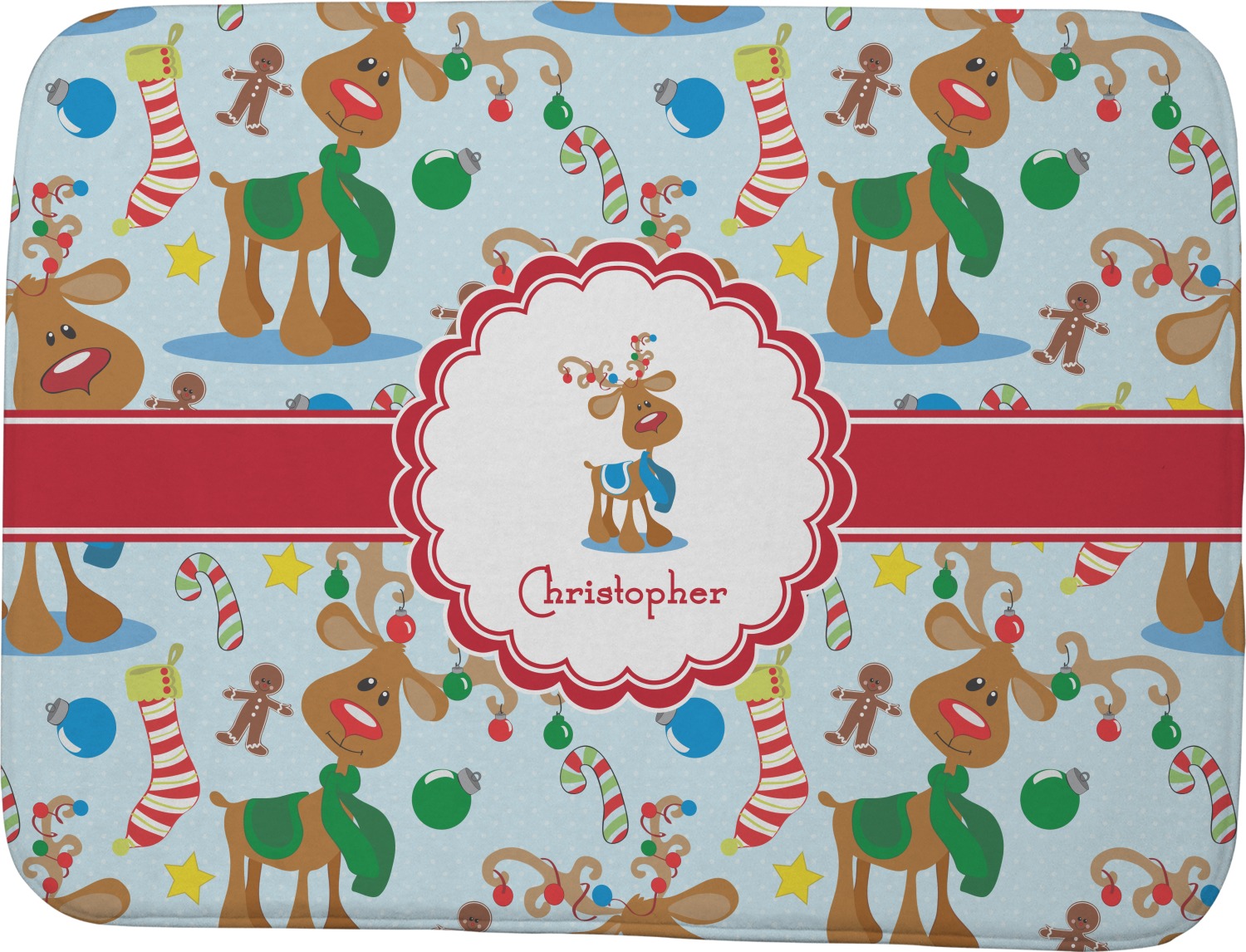 Who doesn't love reindeer? Everyone can agree this fun design of Santa's famous helpers clad in festive scarves and ornaments on their antlers, surrounded by candy canes, gingerbread men, and Christmas stockings, likely stuffed with even more goodies, is absolutely adorable. The ribbon and label are red, and the label includes a little reindeer, ready for the holidays, along with your name or text for personalization.