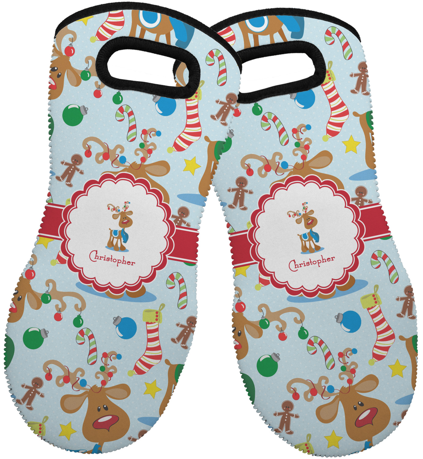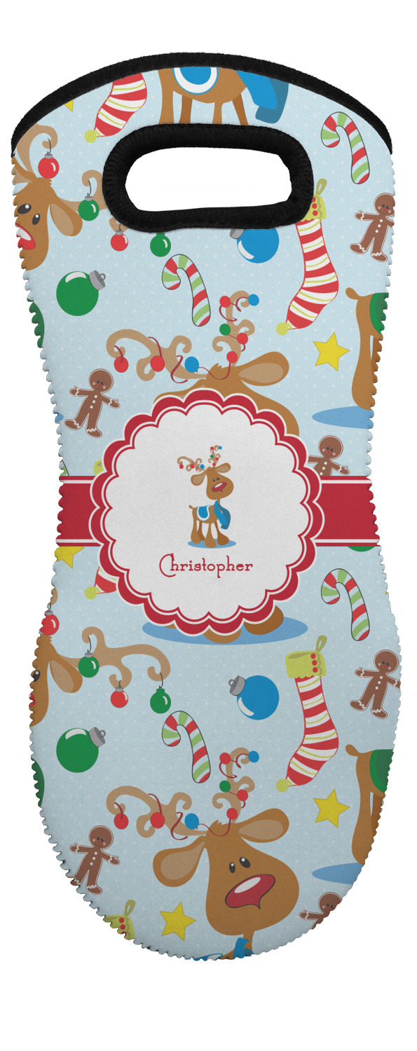 These heat resistant gloves are made entirely of a durable neoprene; the front features a softer texture, while the palm's side has a textured surface, meant to handle heat up to 500 degrees Fahrenheit. Thick, heavy duty stitching connects the two sides. A small, oval cutout appears on the front, and can be used to hang and store the mitt. Your personalization appears on the front, and the upper part of the back of the mitt. The style of these oven mitts are suitable for both the right and left hand, depending on your needs. If you need one for each hand, be sure to order two!