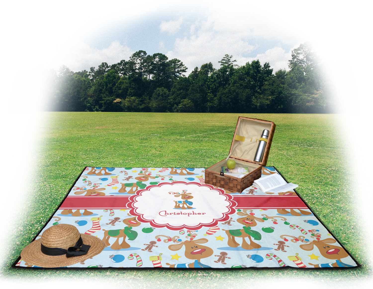 This picnic blanket is perfect for hanging out with your friends at the park or anywhere outside. The top of the blanket is made of a super soft microfiber fleece. The bottom of the blanket is made of a black material similar to a rain jacket and is water repellent as well. This will keep any wet spots on the ground from soaking through your picnic blanket. No one likes a wet blanket. The blanket measures at approximately 50" x 59" and has a nicely finished ribbon edge.