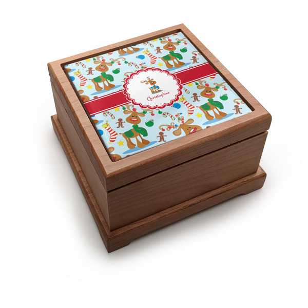 Who doesn't love reindeer? Everyone can agree this fun design of Santa's famous helpers clad in festive scarves and ornaments on their antlers, surrounded by candy canes, gingerbread men, and Christmas stockings, likely stuffed with even more goodies, is absolutely adorable. The ribbon and label are red, and the label includes a little reindeer, ready for the holidays, along with your name or text for personalization.