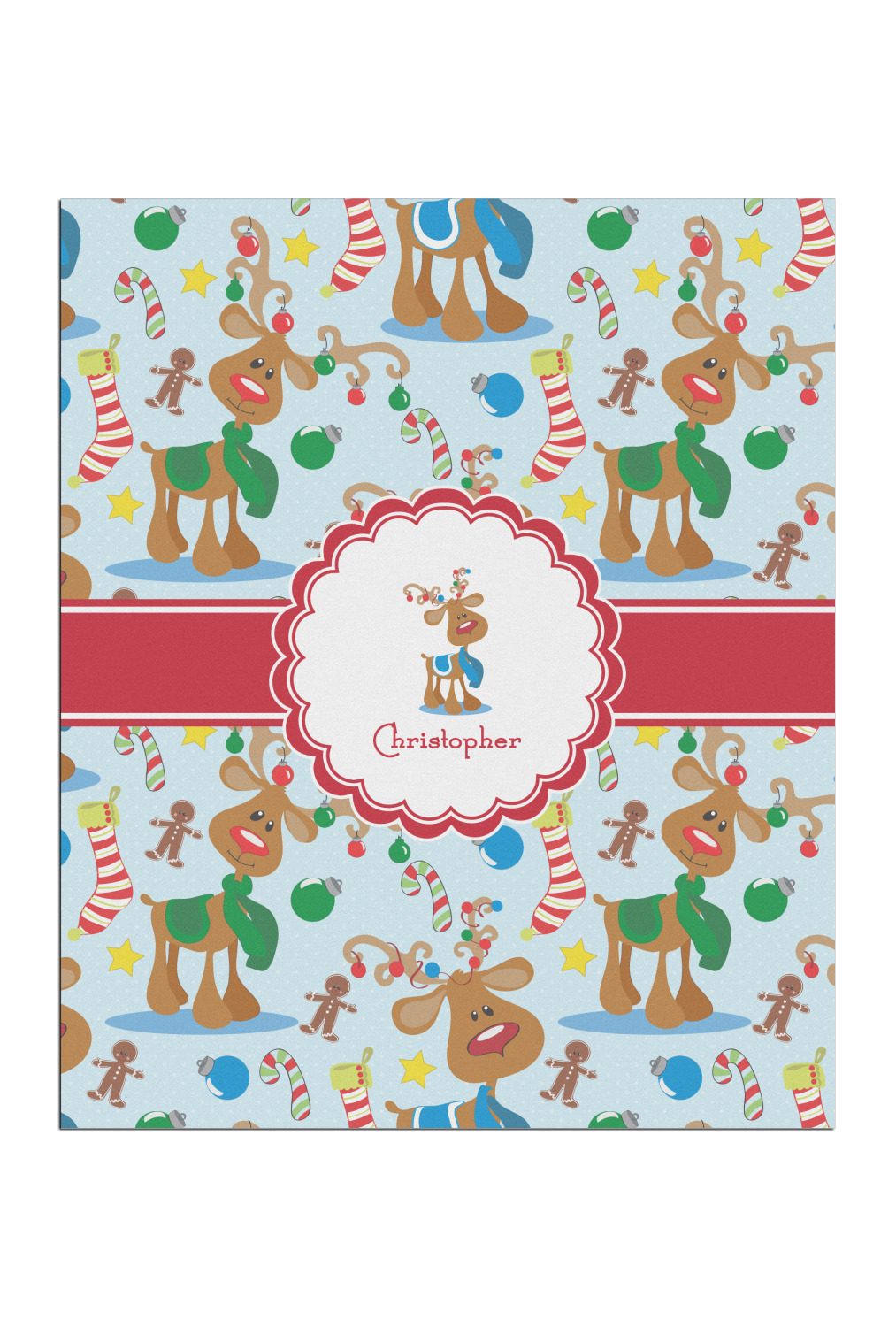 Who doesn't love reindeer? Everyone can agree this fun design of Santa's famous helpers clad in festive scarves and ornaments on their antlers, surrounded by candy canes, gingerbread men, and Christmas stockings, likely stuffed with even more goodies, is absolutely adorable. The ribbon and label are red, and the label includes a little reindeer, ready for the holidays, along with your name or text for personalization.