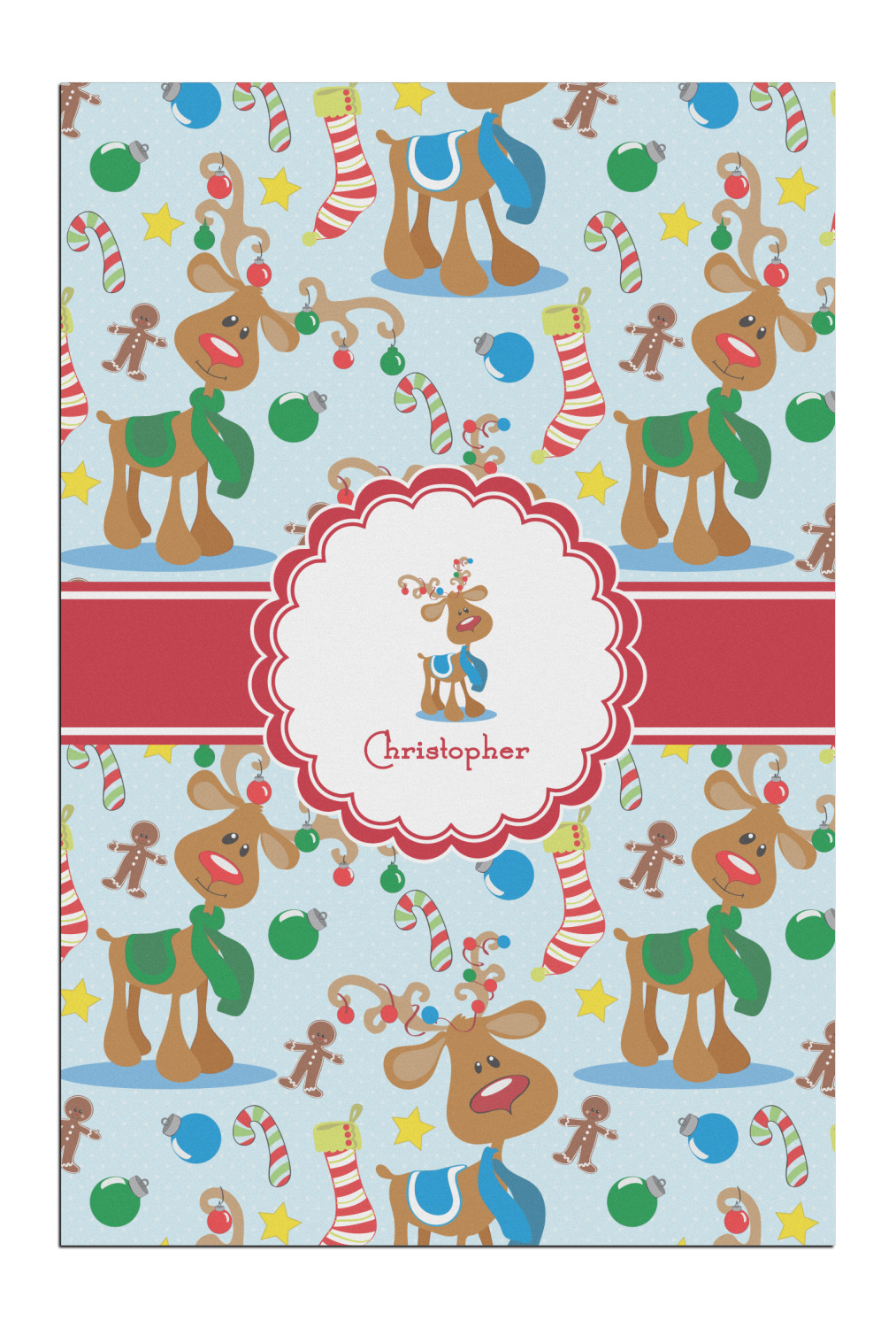 Who doesn't love reindeer? Everyone can agree this fun design of Santa's famous helpers clad in festive scarves and ornaments on their antlers, surrounded by candy canes, gingerbread men, and Christmas stockings, likely stuffed with even more goodies, is absolutely adorable. The ribbon and label are red, and the label includes a little reindeer, ready for the holidays, along with your name or text for personalization.