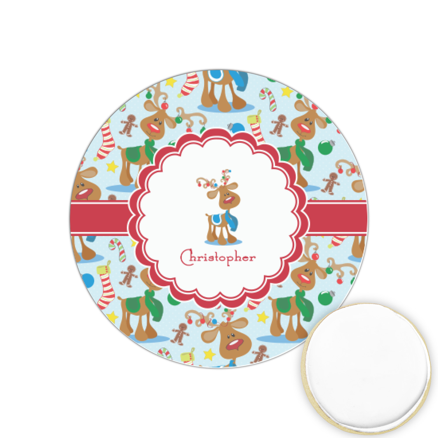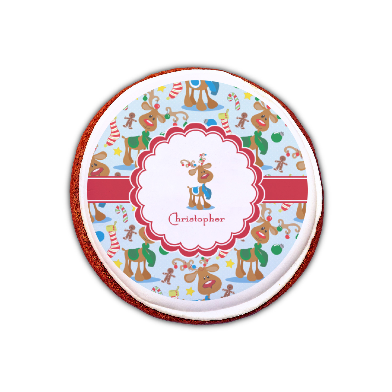 Who doesn't love reindeer? Everyone can agree this fun design of Santa's famous helpers clad in festive scarves and ornaments on their antlers, surrounded by candy canes, gingerbread men, and Christmas stockings, likely stuffed with even more goodies, is absolutely adorable. The ribbon and label are red, and the label includes a little reindeer, ready for the holidays, along with your name or text for personalization.