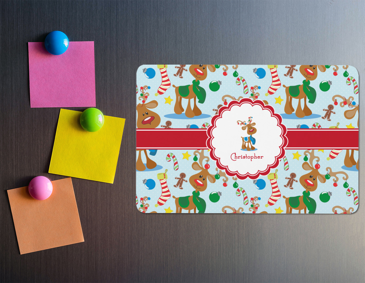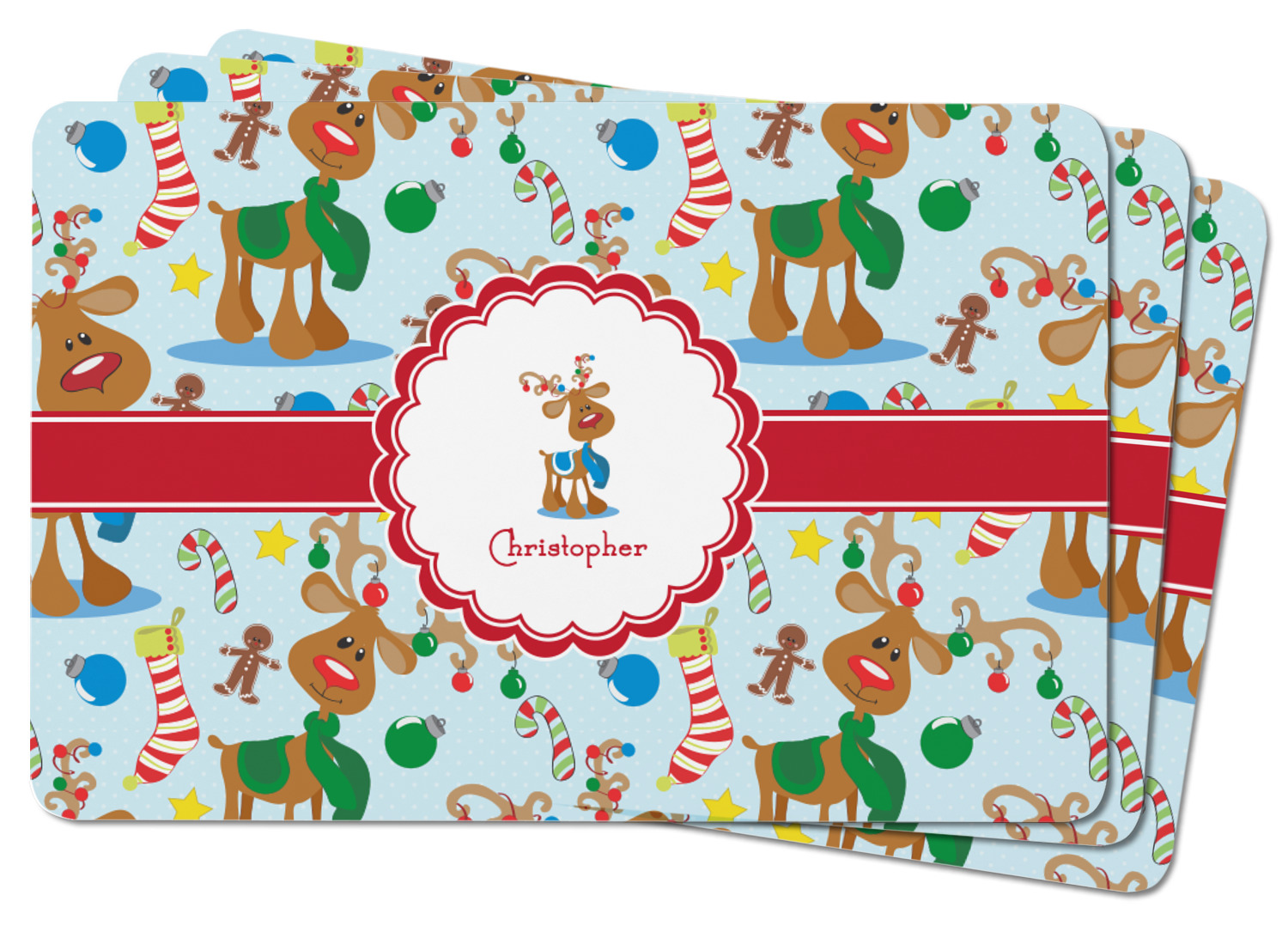 Who doesn't love reindeer? Everyone can agree this fun design of Santa's famous helpers clad in festive scarves and ornaments on their antlers, surrounded by candy canes, gingerbread men, and Christmas stockings, likely stuffed with even more goodies, is absolutely adorable. The ribbon and label are red, and the label includes a little reindeer, ready for the holidays, along with your name or text for personalization.