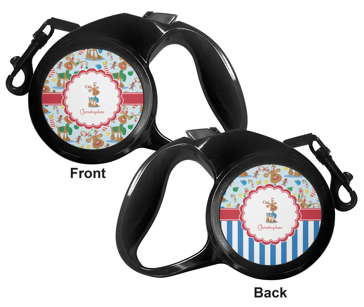 The leash's plastic handle is accommodating of your grip and displays your customization on both sides. The dog leash also features the traditional bolt snap clip, for easy fastening to your dog's collar. The leash and leash handle themselves are both black in color.