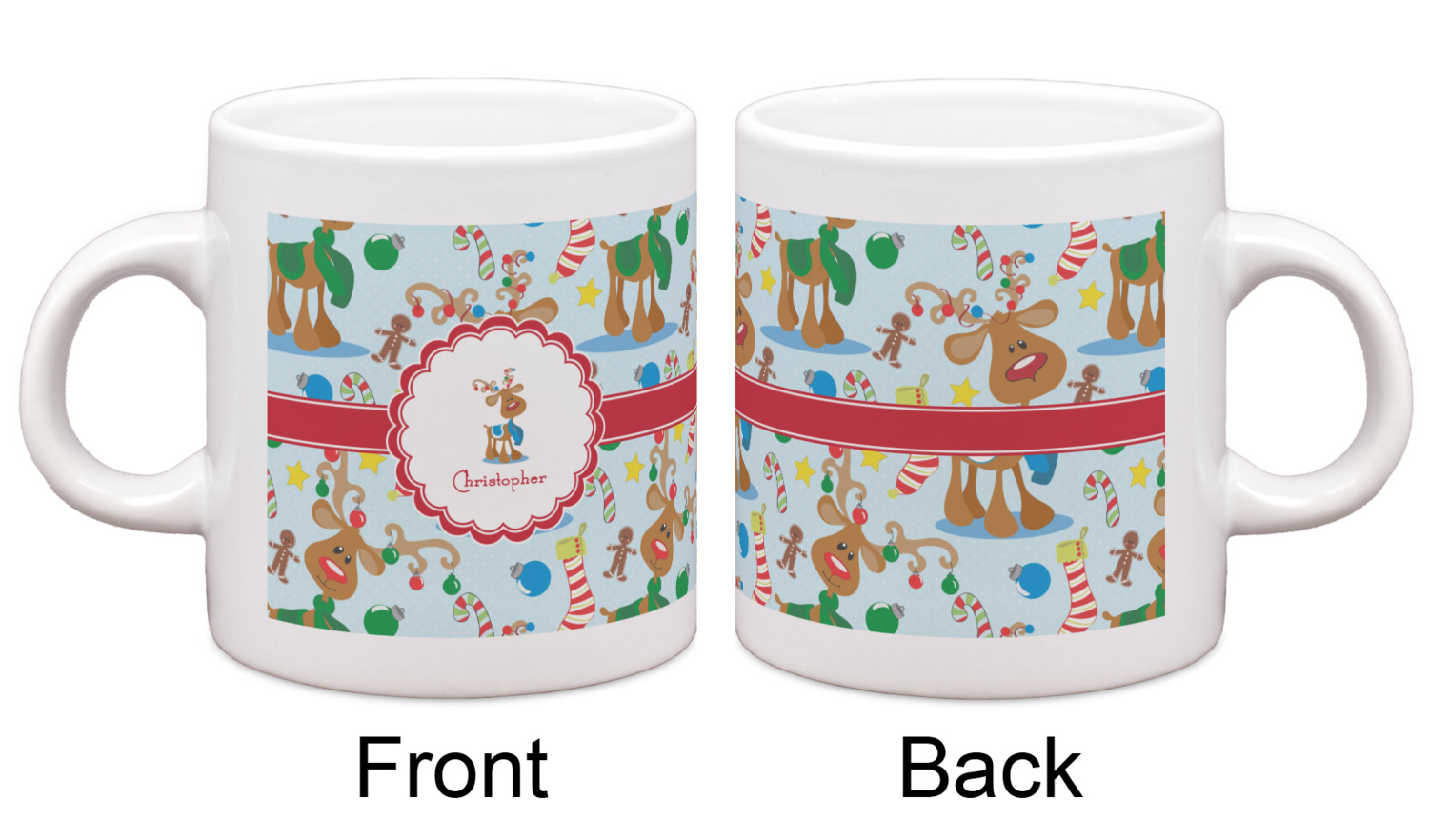 Who doesn't love reindeer? Everyone can agree this fun design of Santa's famous helpers clad in festive scarves and ornaments on their antlers, surrounded by candy canes, gingerbread men, and Christmas stockings, likely stuffed with even more goodies, is absolutely adorable. The ribbon and label are red, and the label includes a little reindeer, ready for the holidays, along with your name or text for personalization.