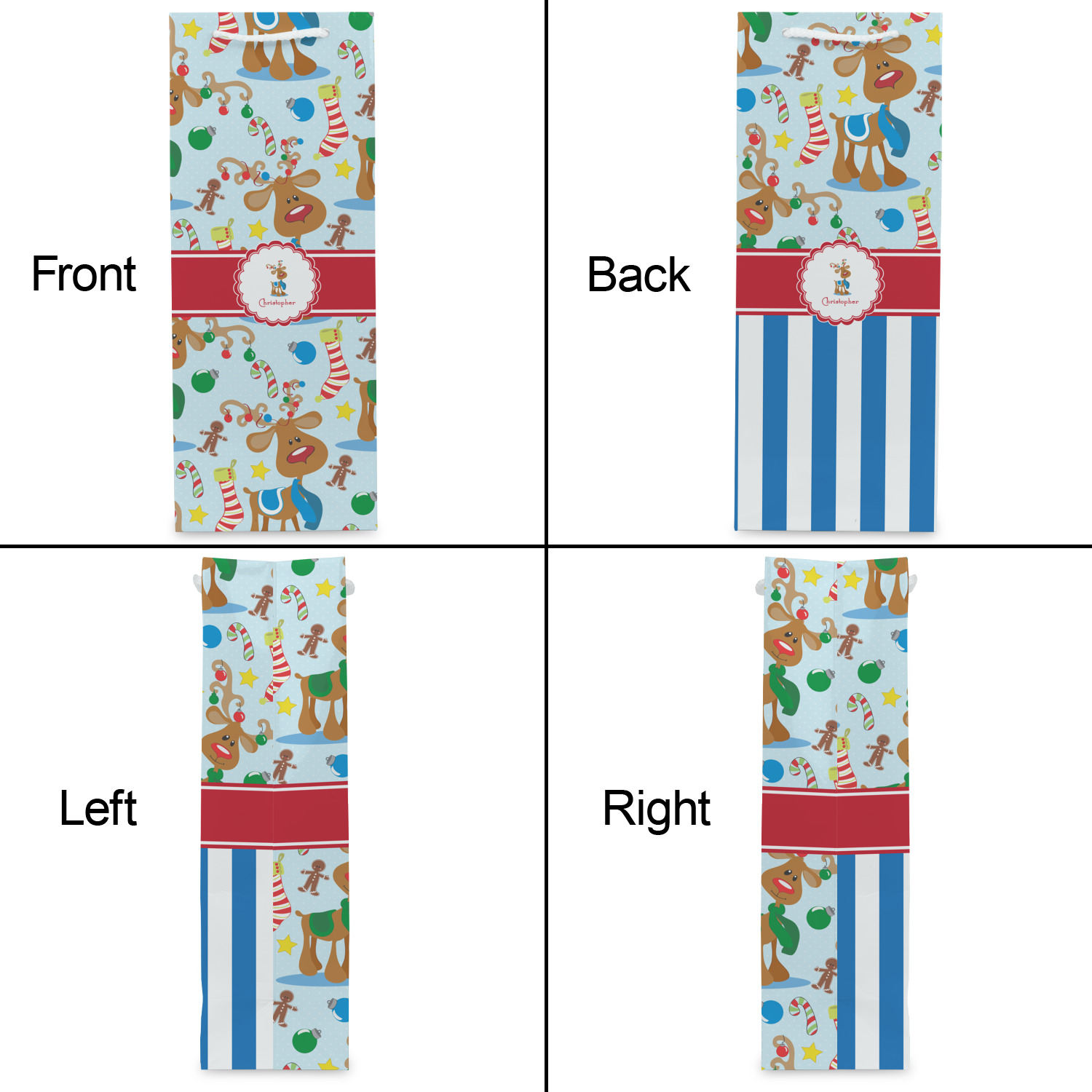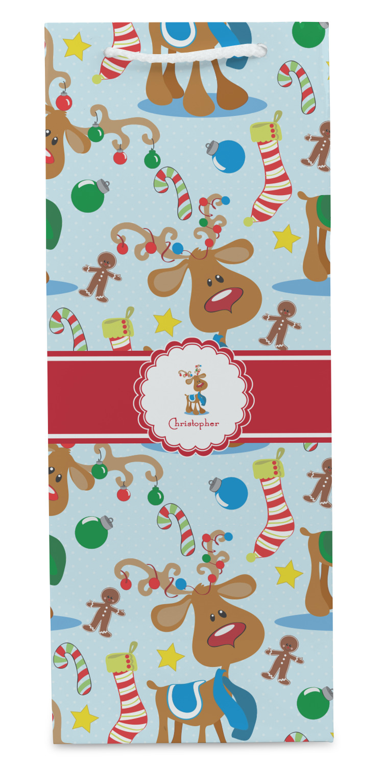 Who doesn't love reindeer? Everyone can agree this fun design of Santa's famous helpers clad in festive scarves and ornaments on their antlers, surrounded by candy canes, gingerbread men, and Christmas stockings, likely stuffed with even more goodies, is absolutely adorable. The ribbon and label are red, and the label includes a little reindeer, ready for the holidays, along with your name or text for personalization.