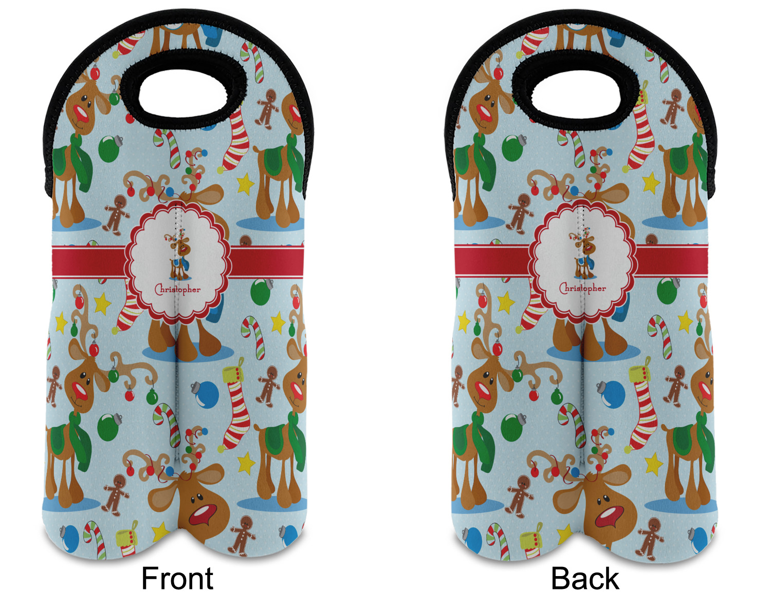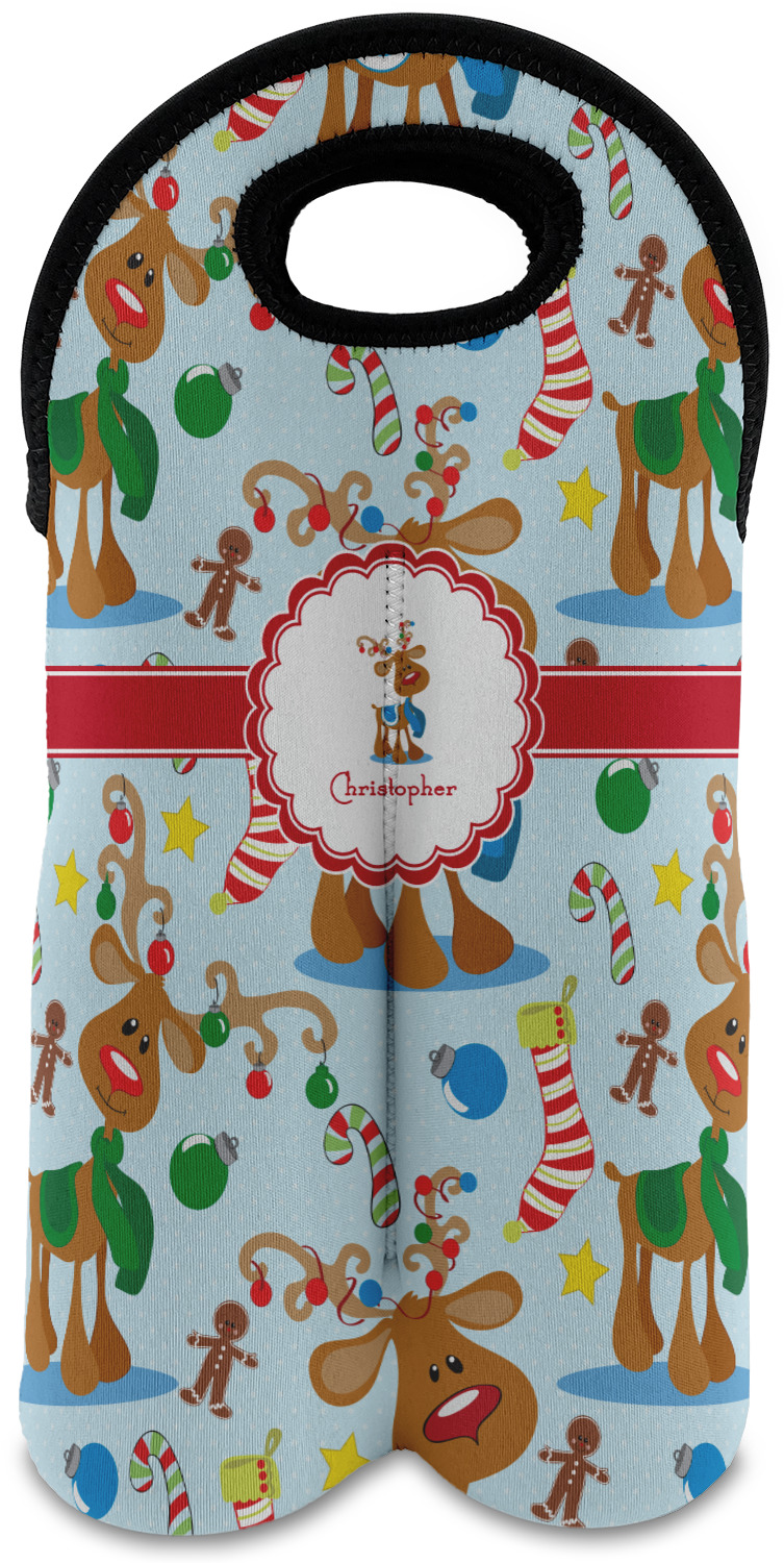 Who doesn't love reindeer? Everyone can agree this fun design of Santa's famous helpers clad in festive scarves and ornaments on their antlers, surrounded by candy canes, gingerbread men, and Christmas stockings, likely stuffed with even more goodies, is absolutely adorable. The ribbon and label are red, and the label includes a little reindeer, ready for the holidays, along with your name or text for personalization.