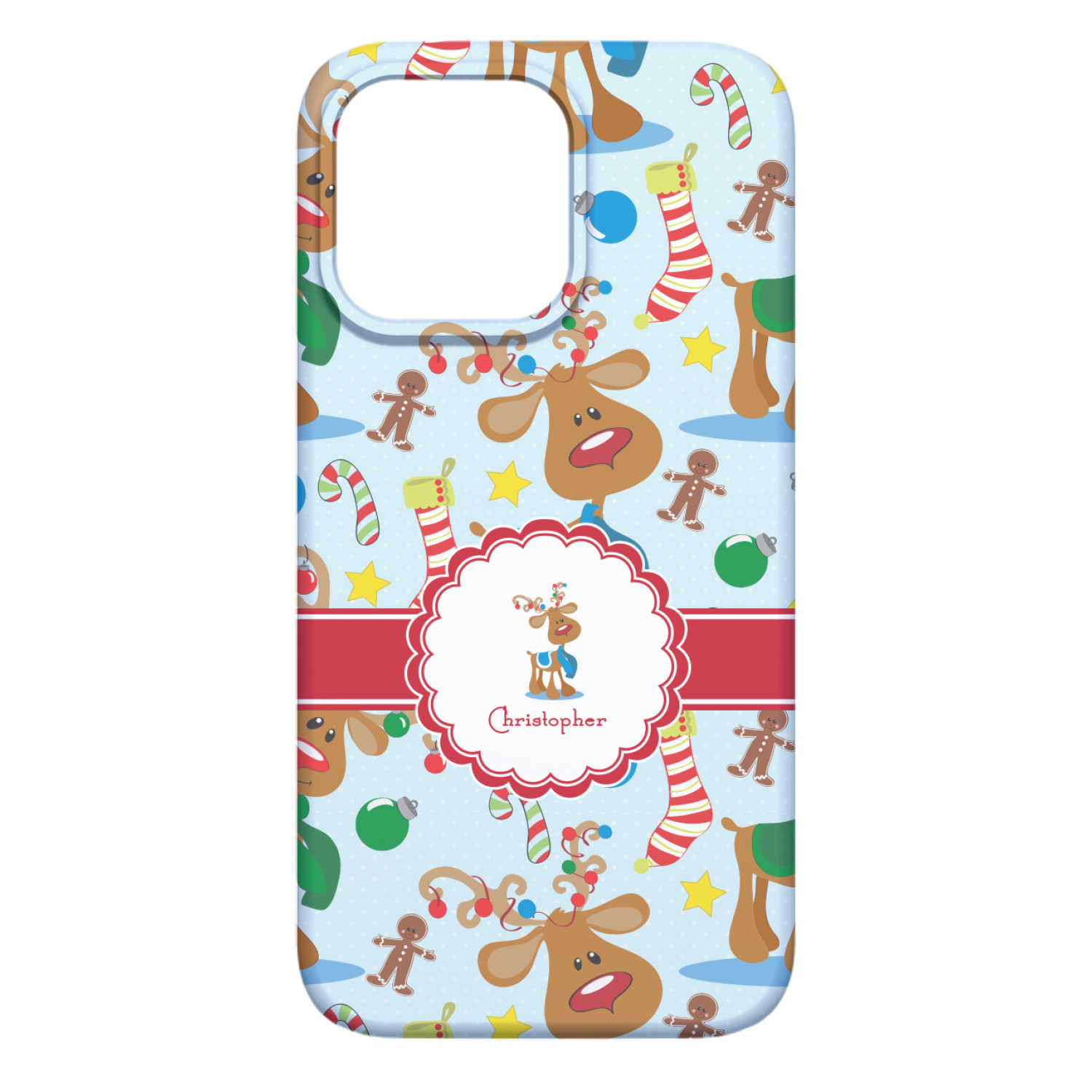 Who doesn't love reindeer? Everyone can agree this fun design of Santa's famous helpers clad in festive scarves and ornaments on their antlers, surrounded by candy canes, gingerbread men, and Christmas stockings, likely stuffed with even more goodies, is absolutely adorable. The ribbon and label are red, and the label includes a little reindeer, ready for the holidays, along with your name or text for personalization.