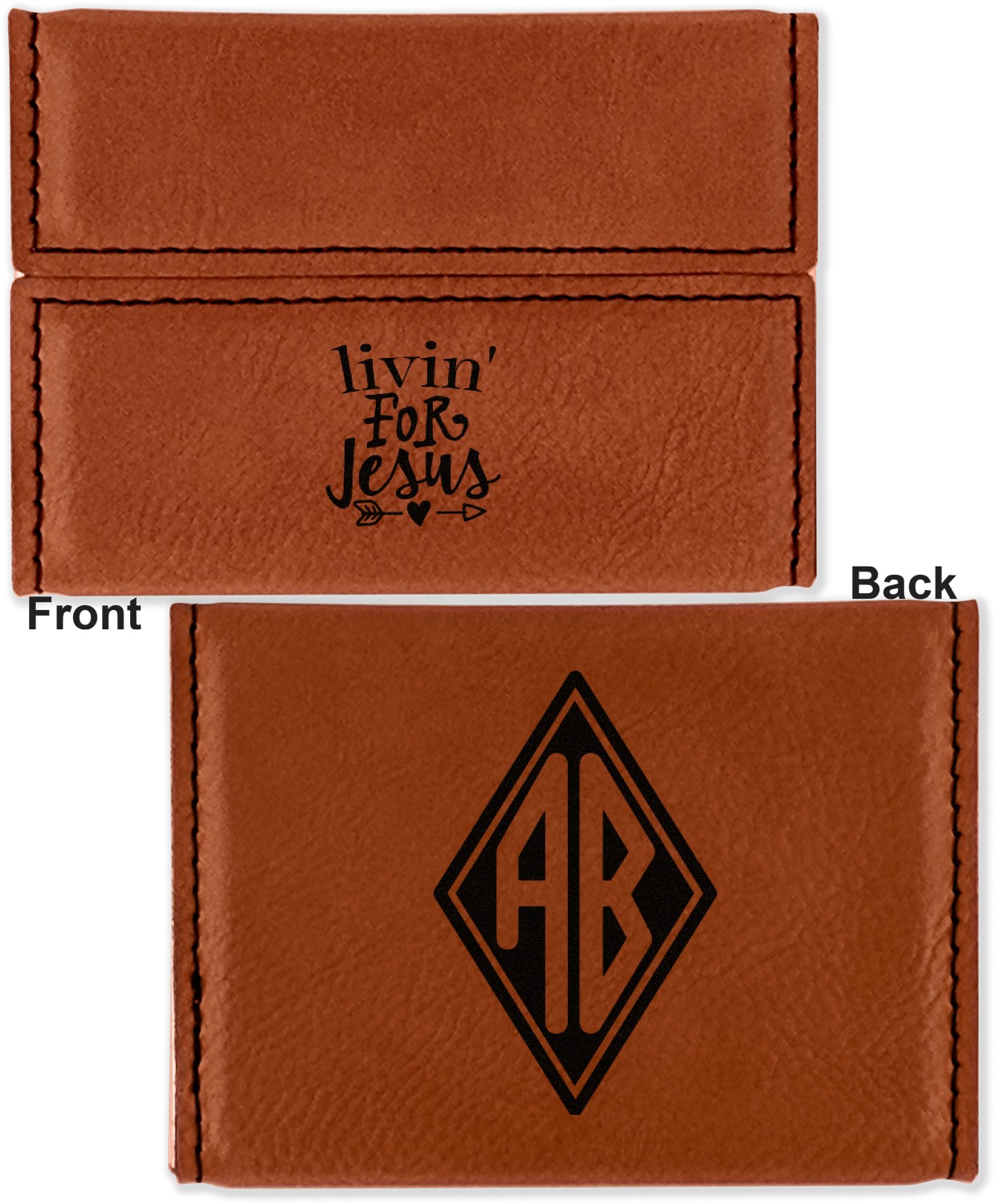 Your personalized design is laser engraved onto either the front, or the front and back of the card holder, depending on the model you purchase. Once engraved, the design will appear a darkened black against the cognac color of the leatherette.