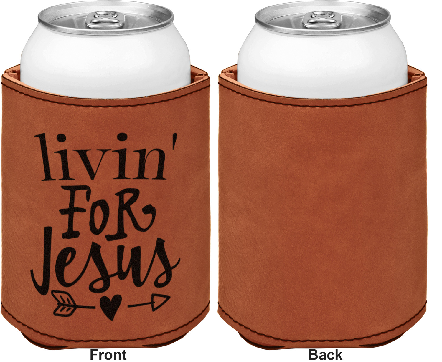 This can sleeve is made from a cognac-brown leatherette and stitched with a sturdy, black thread. A slim padding lines the inside of your can sleeve to allow for a better fit once your drink is inserted. The sleeve itself measures at 4 by 4.5 inches, allowing this custom can sleeve to accommodate most canned drinks. Your personalized design can be engraved on the front and back, or solely the front. When laser-engraved, your design appears as a black coloration which contrasts the leatherette nicely.