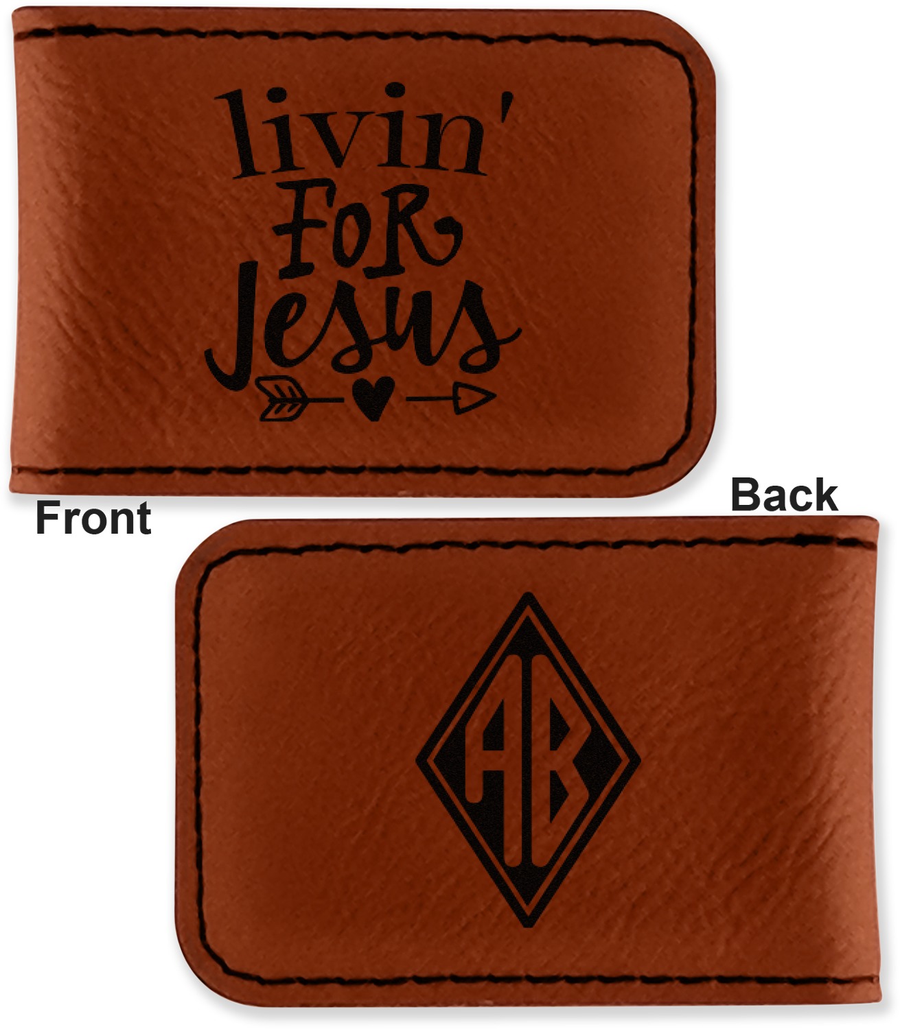 Your money clip will be laser engraved so that the design you choose will come out black. Find a fun graphic, monogram, or font to use to personalize your money clip either on just the front or the front and the back.