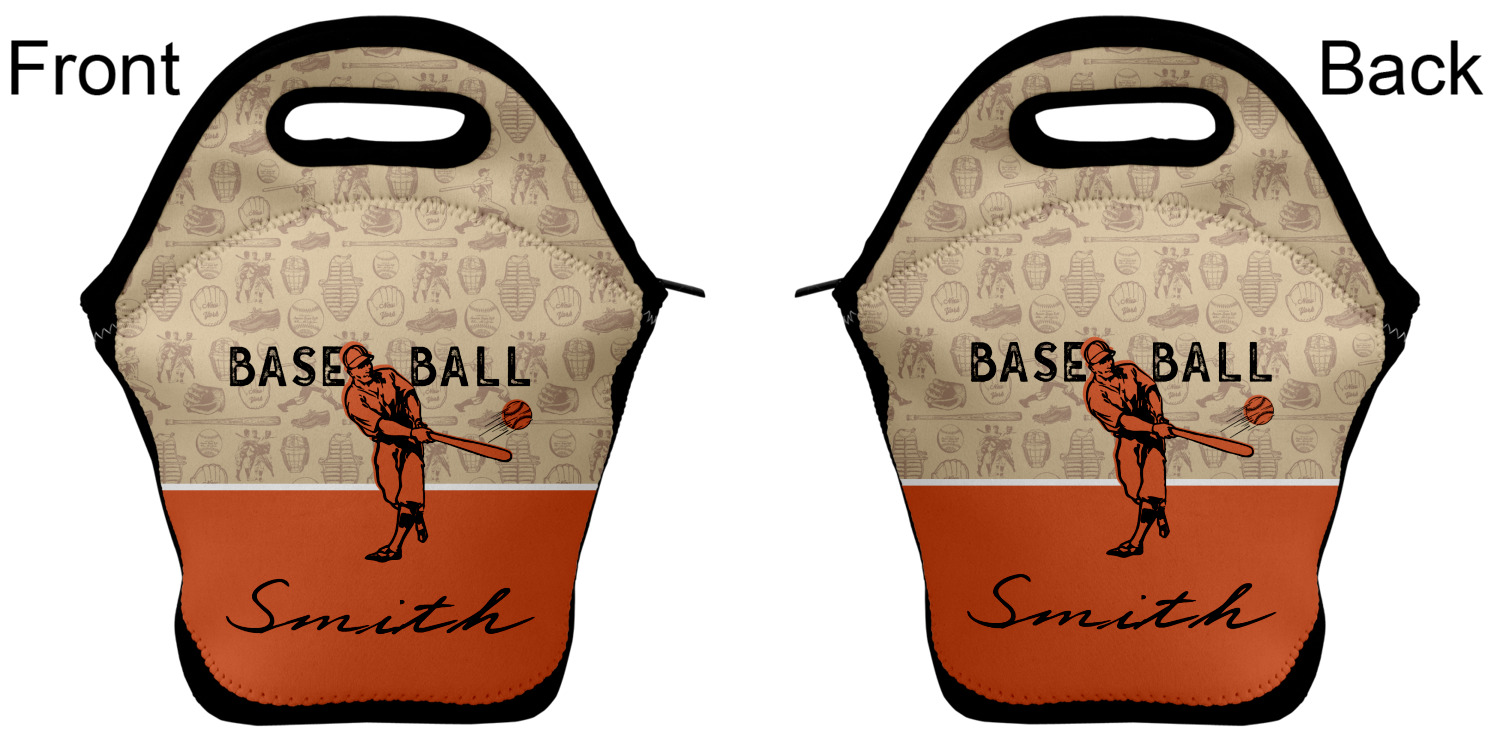 Our personalized lunch bags are made from a strong neoprene, and secure with a zipper closure that lines the top of the bag.The edges of the neoprene are sewn together with a heavy duty stitch, adding to the durability of the bag. The is accompanied by a reinforced handle at its top, for the easy transport of your lunch. We display your personalization across both the front and back of this neoprene lunch bag, while the remaining sides are a sleek black in color. Each bag measures at 13.5 inches tall, and 11.5 inches wide.