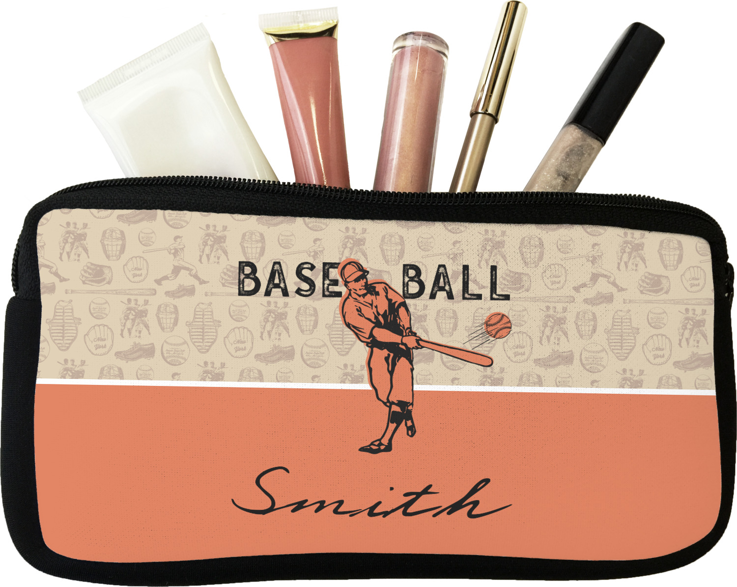 Our personalized makeup bags are available in many different designs, patterns and colors - so you are sure to find one that will love. They are made of neoprene (same material as wet-suits) and thus are water resistant, so spillages in your makeup bag will not end up all over you purse. They are customized on one side and are black on the other side and the zipper is black as well.