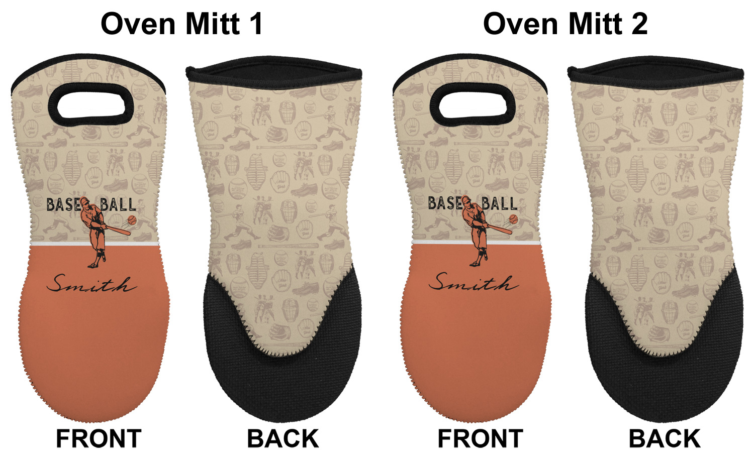 These heat resistant gloves are made entirely of a durable neoprene; the front features a softer texture, while the palm's side has a textured surface, meant to handle heat up to 500 degrees Fahrenheit. Thick, heavy duty stitching connects the two sides. A small, oval cutout appears on the front, and can be used to hang and store the mitt. Your personalization appears on the front, and the upper part of the back of the mitt. The style of these oven mitts are suitable for both the right and left hand, depending on your needs. If you need one for each hand, be sure to order two!
