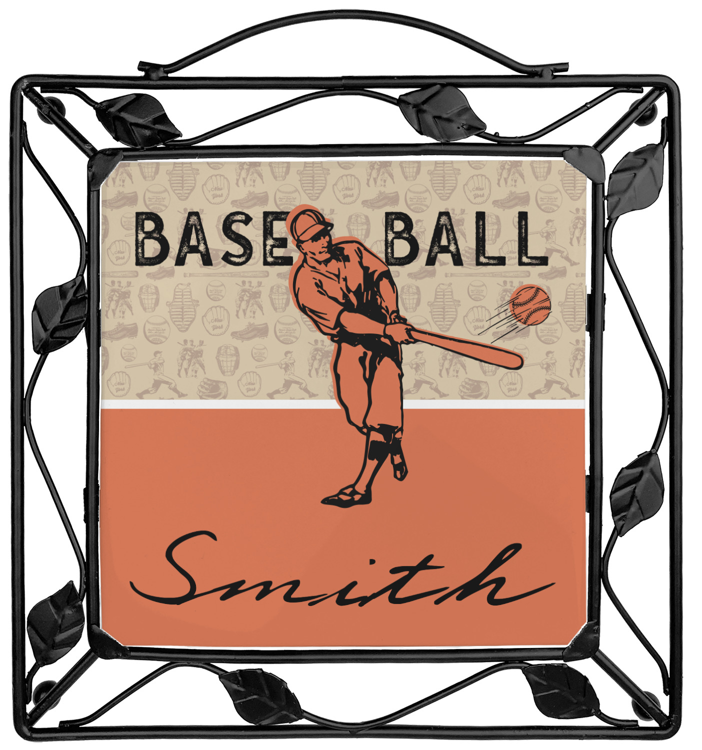 Our square trivets are made from a durable, wrought iron. This model features 4 small half circles, one on each corner, and a larger ring of iron that circles the central, customized tile. Each of the 4 corners has a round foot on its bottom for stability. This trivet is 8.75 by 8.75 inches, but the central tile measures at 6 inches on both sides.