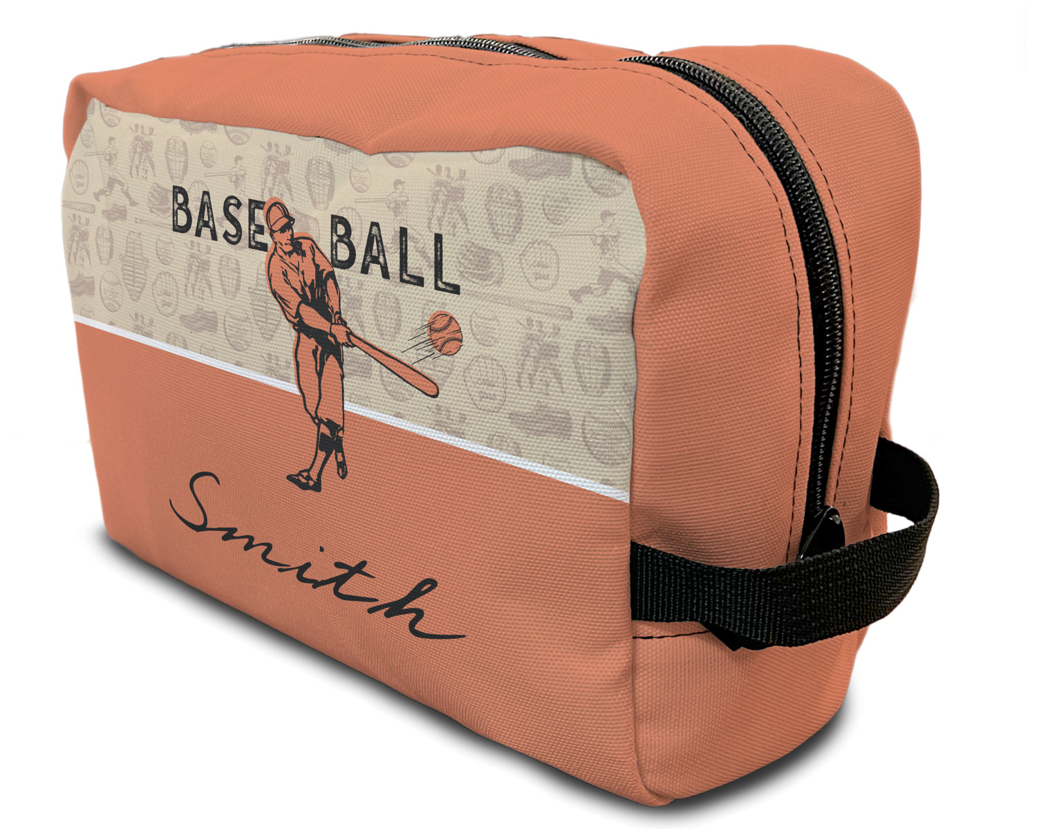 Our toiletry bag has the traditional dopp kit design i.e. a side to side zippered closure, giving you easy access to all the contents inside and a sturdy handle on one side of the bag. The canvas fabric for dopp kits is printed, then cut and sewn here in the USA.