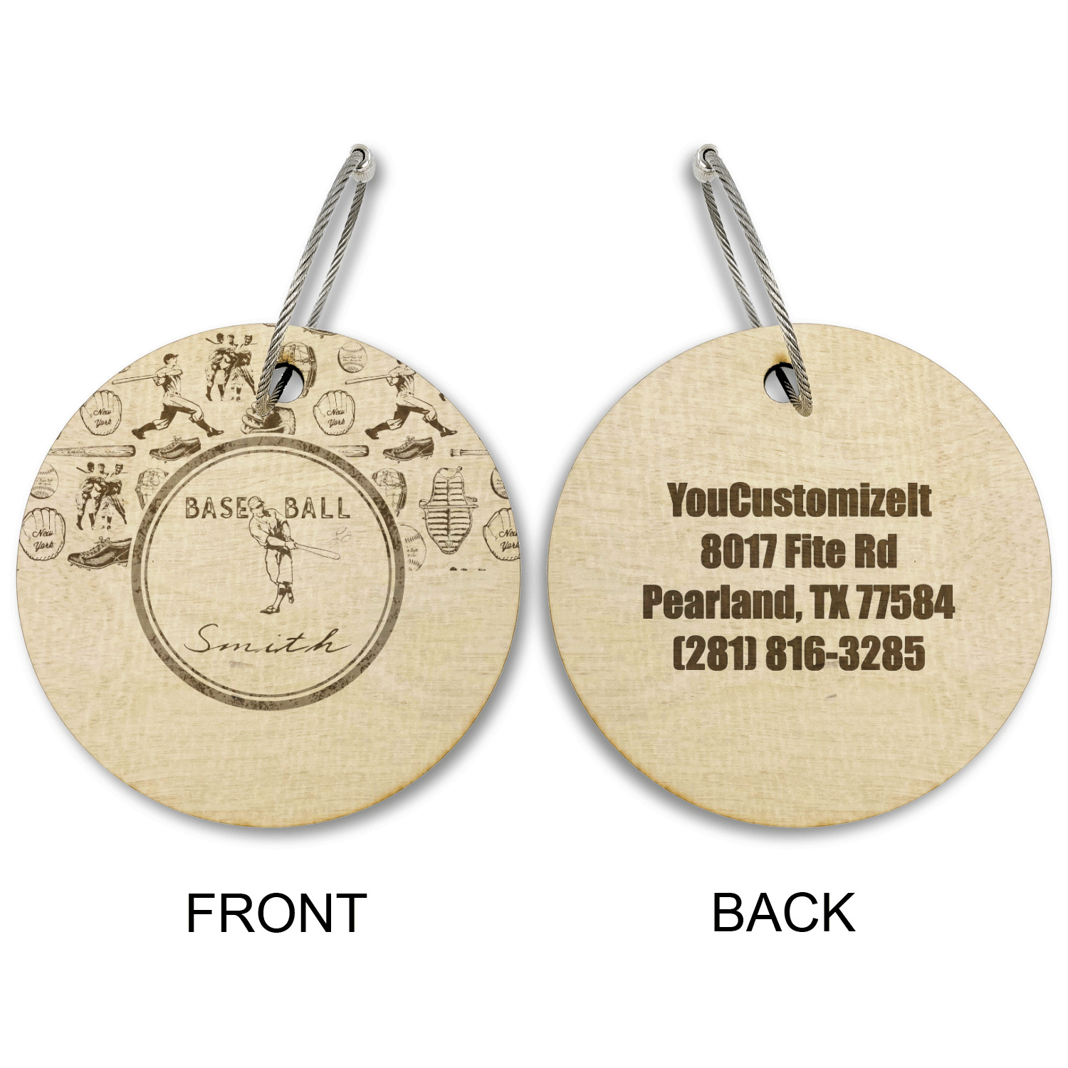 Made from a premium hardwood, these luggage tags are laser engraved and cut just for you. The front contains your design of choice and the back has your contact information to ensure your luggage gets back to you if ever lost.