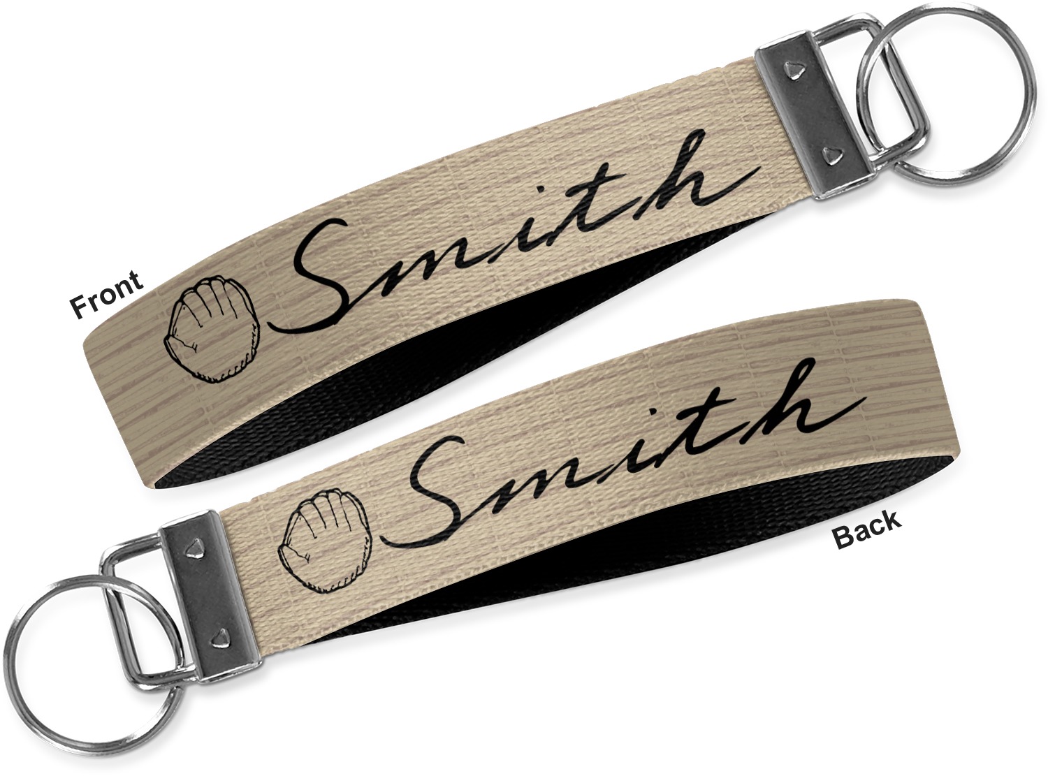 These key fob keychains are made from a polyester weave, right here in the USA. They feature a silver, metal clasp, attached to a round keyring. The piece gives the personalized wristlet a beautiful, finished look. Your customized design is printed on the outside of the keychain strap. We carry these wristlets in two sizes: small, which is 5 inches in width, and large, which is 5.5 inches in width.