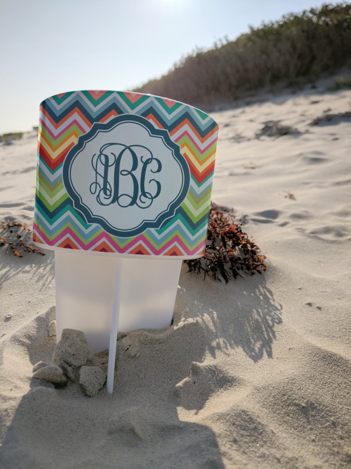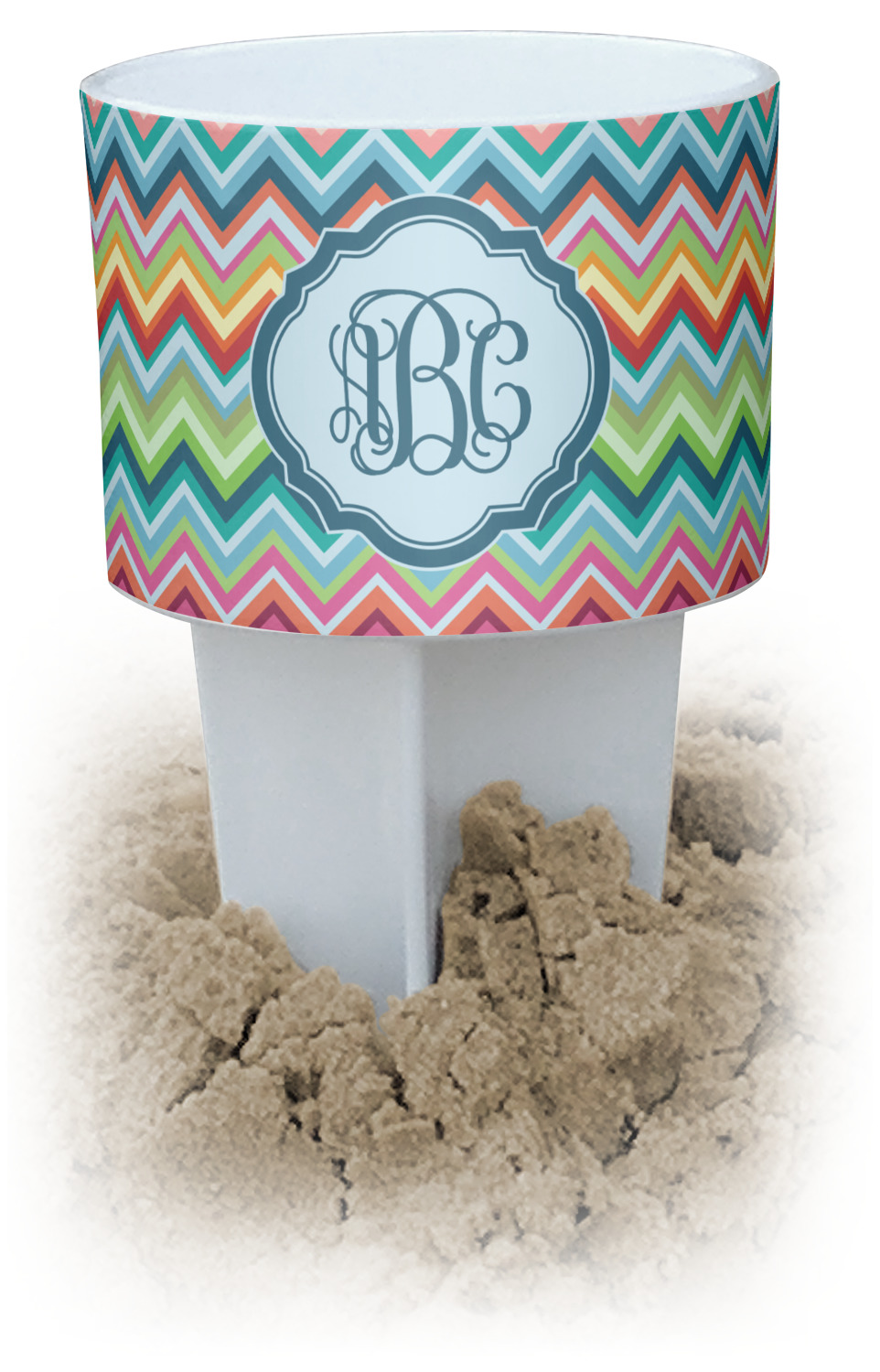 This cup holder has a large stake at its bottom that anchors it to the sand or ground below, while the cup holder rests above the stake. The entire drink holder is made of durable plastic and displays your customization around the cup holder portion. We sell these personalized beach spikers in two different colors: black and white.